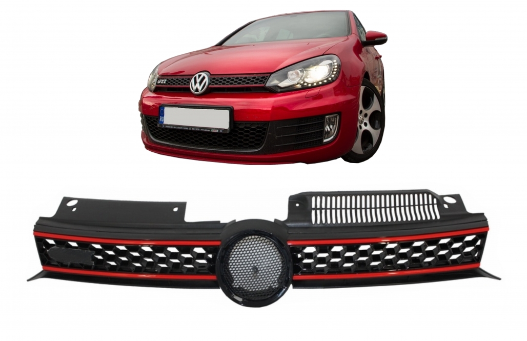 Oferă mașinii tale un plus de stil cu această grilă centrală VW Golf 6 în stil GTI Design, realizată pentru a evidenția partea frontală printr-un aspect sportiv și agresiv. Finisajul negru mat împreună cu linia roșie decorativă completează perfect designul modelului Golf VI.