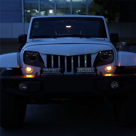 Fabricat din plastic ABS de inalta calitate Culoare: Negru mat Ofera Jeep-ului o privire infricosatoare. Stil agresiv Culoare Angeleyes: Alb si Galben Farurile vin echipate complet cu Led-uri pentru faza scurta si faza lunga Faza scurta 45W Faza Lunga 60W Connector: H4/H13 (Ground and High Beam) Position: Grille turn signal light Voltage: 9V-32V Wattage: 4W LED Type: 8pcs * 0.6W LEDS Work Temperature: -40 ~ 60 Material: Durable ABS Plastic Body Color: Black Lens Color: Smoke LED Color: Amber Dustproof/Waterproof: IP67 Instruction is not included