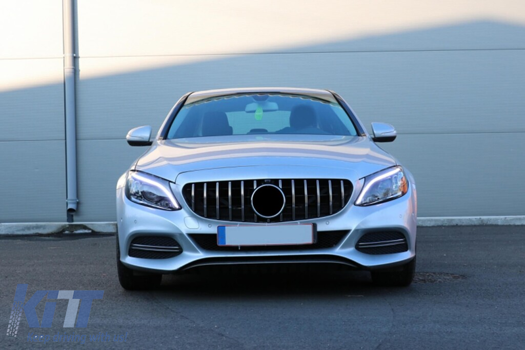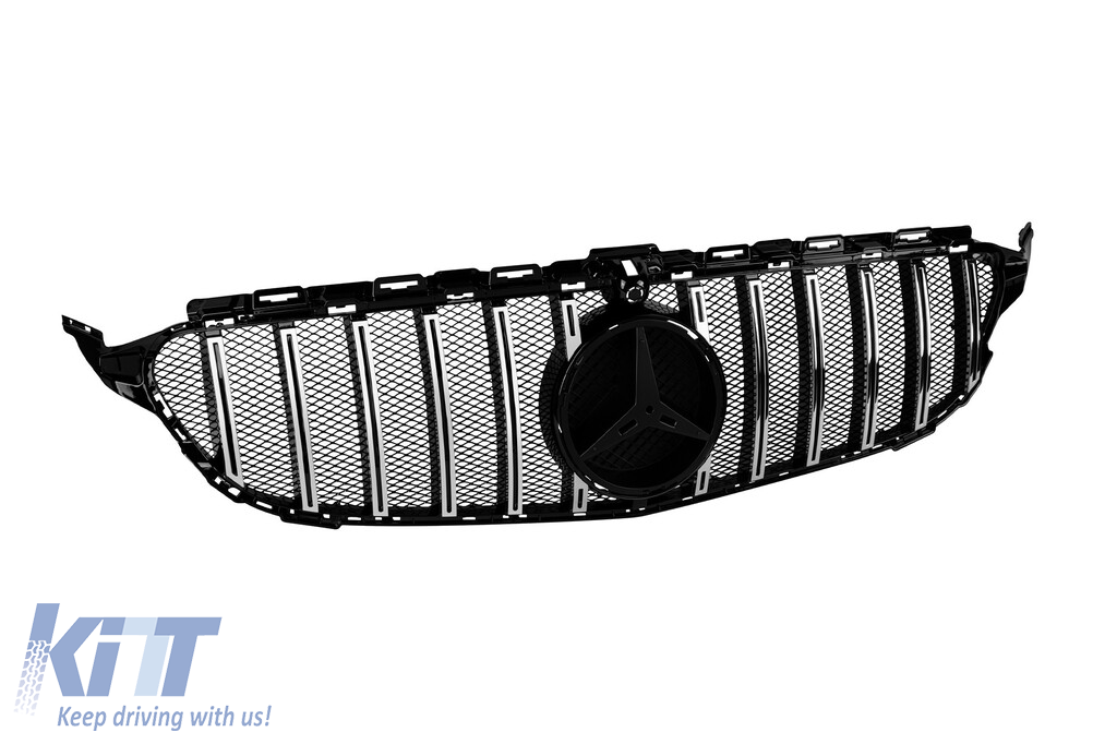 Grilă tip GT crom/neagră potrivită pentru Mercedes Clasa C W205 sedan, S205 break, C205 coupe 2014-2018 cu deschidere pentru cameră Performance AutoTuning