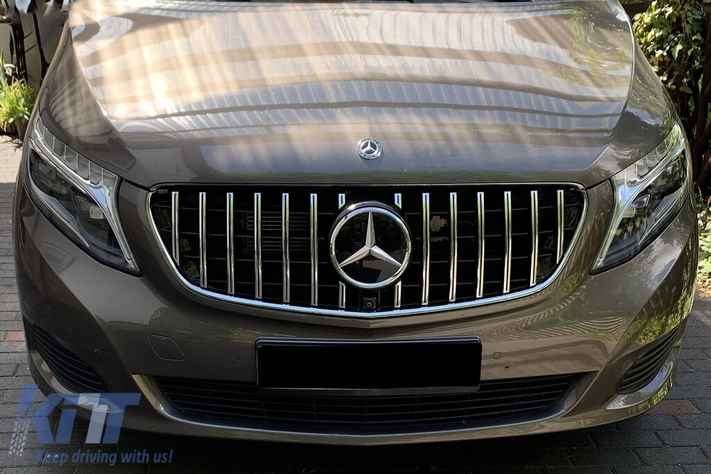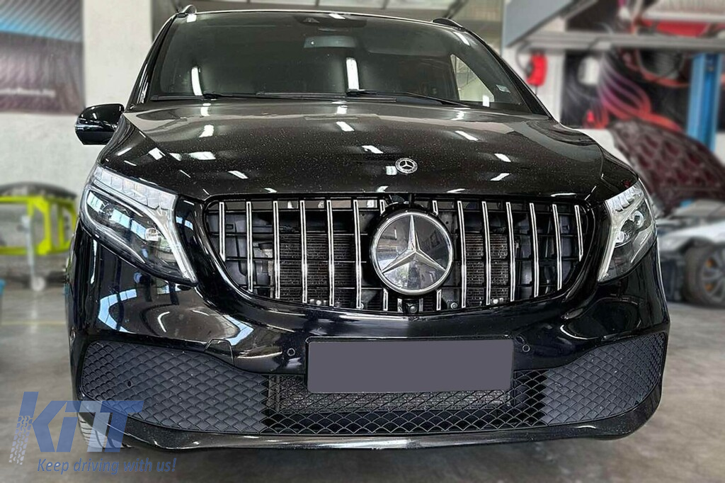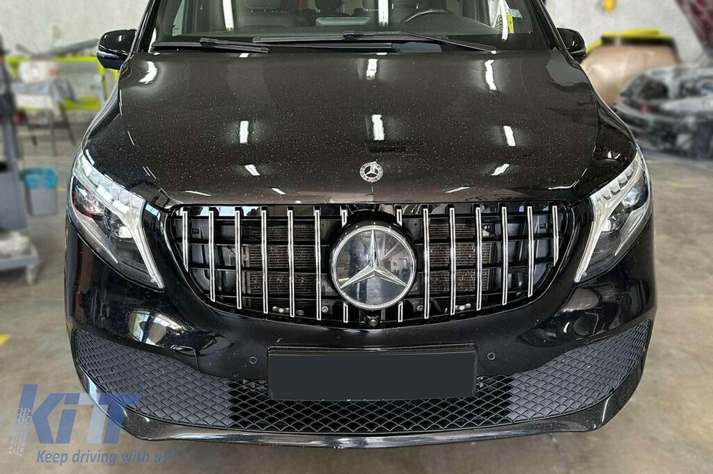 Grilă tip GT crom/neagră potrivită pentru Mercedes V-Class W447 2020-2023 pentru modelul cu bara de protecție frontală standard Performance AutoTuning