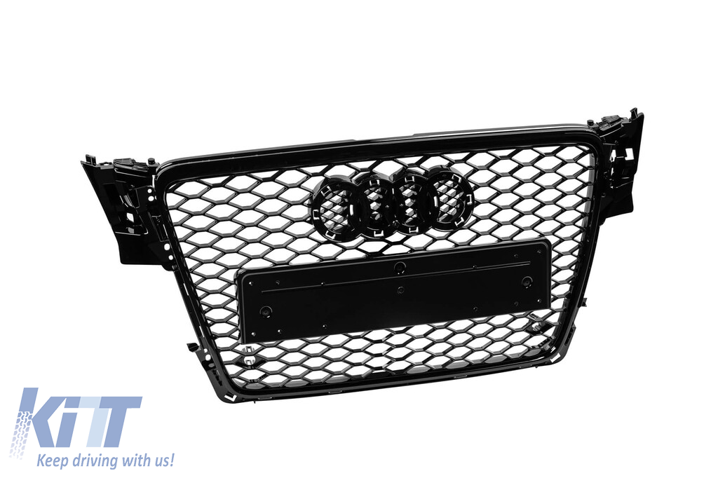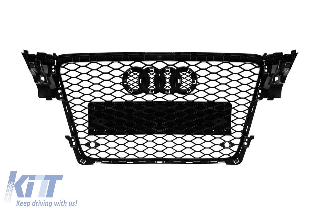 Grilă tip RS4 cu lac negru, potrivită pentru Audi A4 2007-2011 pentru modelele echipate cu bara de protecție frontală standard, cu bază pentru emblemă, cu deschideri pentru senzori de parcare Performance AutoTuning