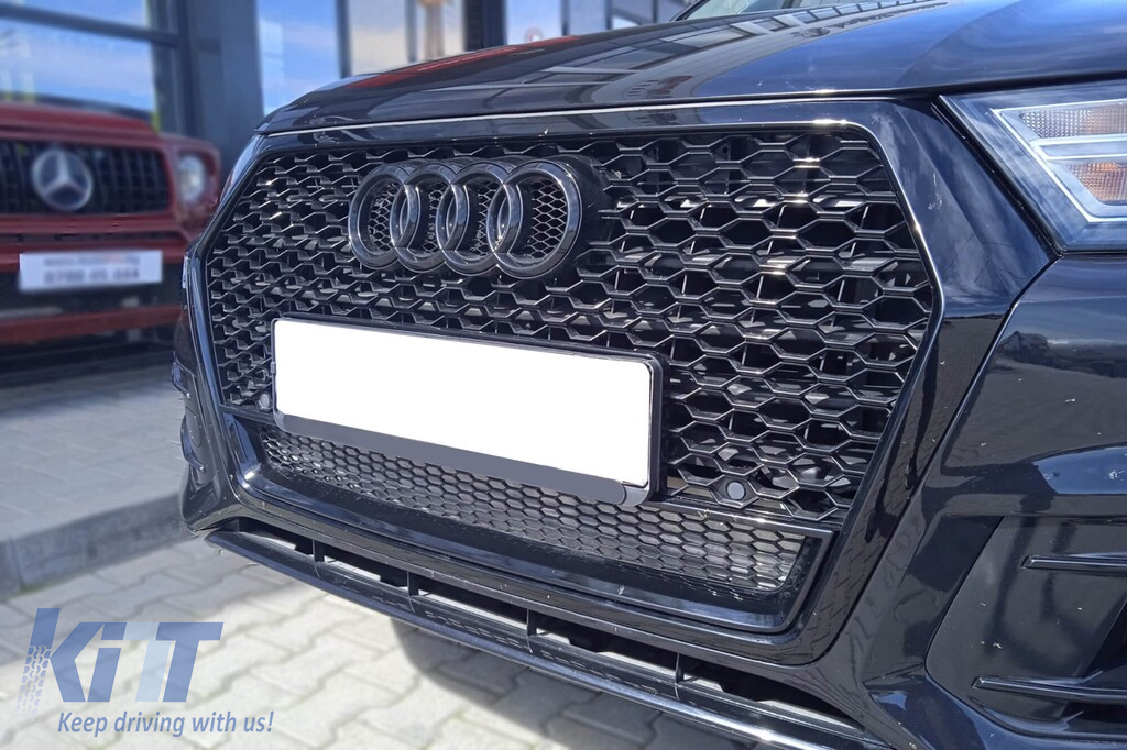 Grilă tip RSQ7 cu lac negru, potrivită pentru Audi Q7 2015-2019, cu deschideri pentru senzorii de parcare Performance AutoTuning