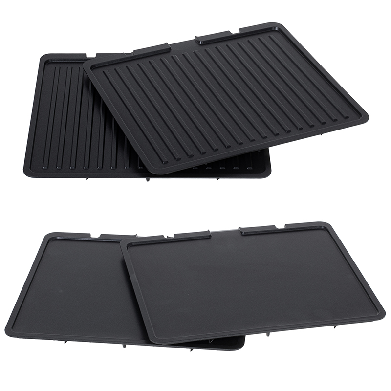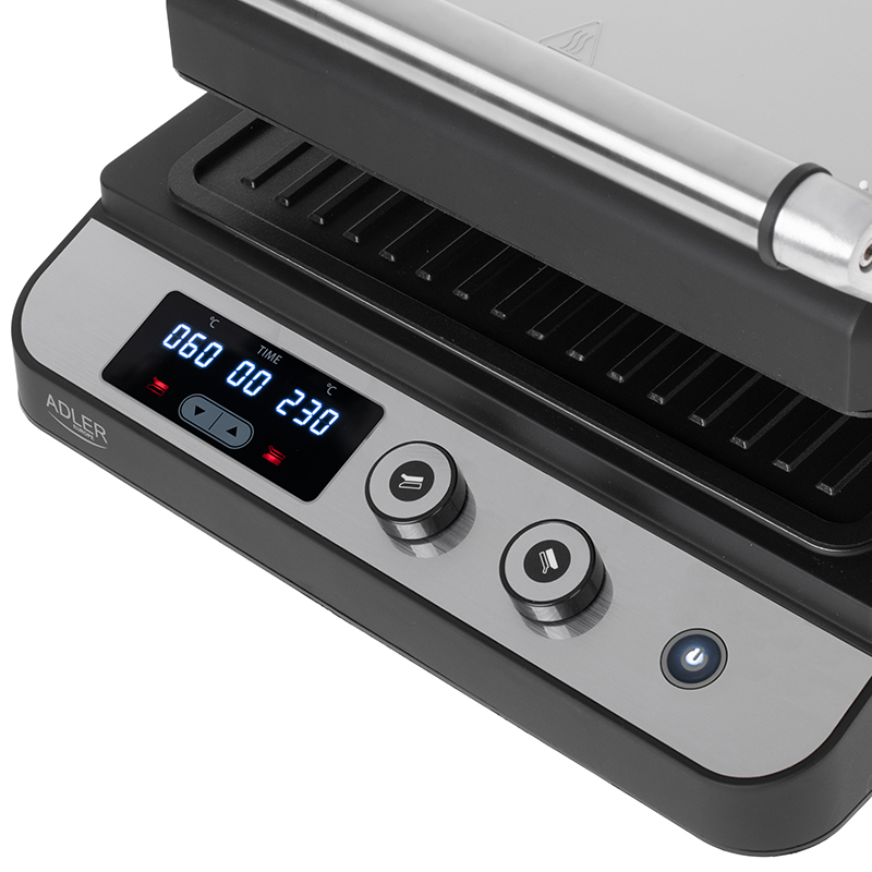Plitele sunt protejate cu un strat de teflon, datorita caruia produsele nu se lipesc, iar spalarea ulterioara dureaza literalmente un moment. In plus, invelisul va permite sa faceti gratar fara a adauga grasime, iar orificiul de scurgere a grasimii face mesele mai sanatoase. Dispozitivul are panou de control cu afisaj LED.