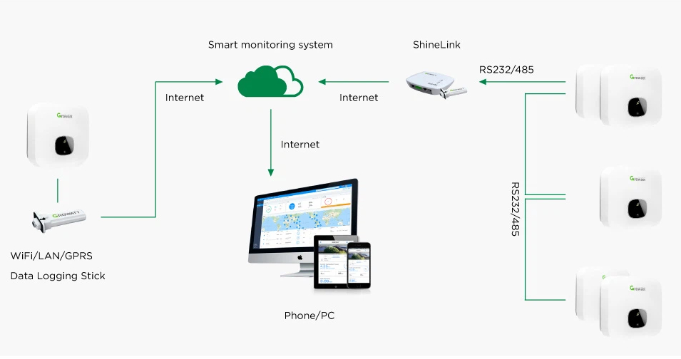 Dispune de interfata USB si port comunicare date RS485, iar impreuna cu dispozitivul de monitorizare wifi - ShineWiFi-X si cu ajutorul aplicatiei disponibila online, veti putea configura si monitoriza parametrii sistemului solar.