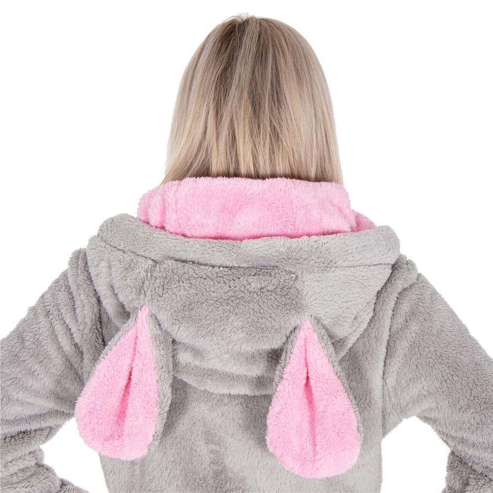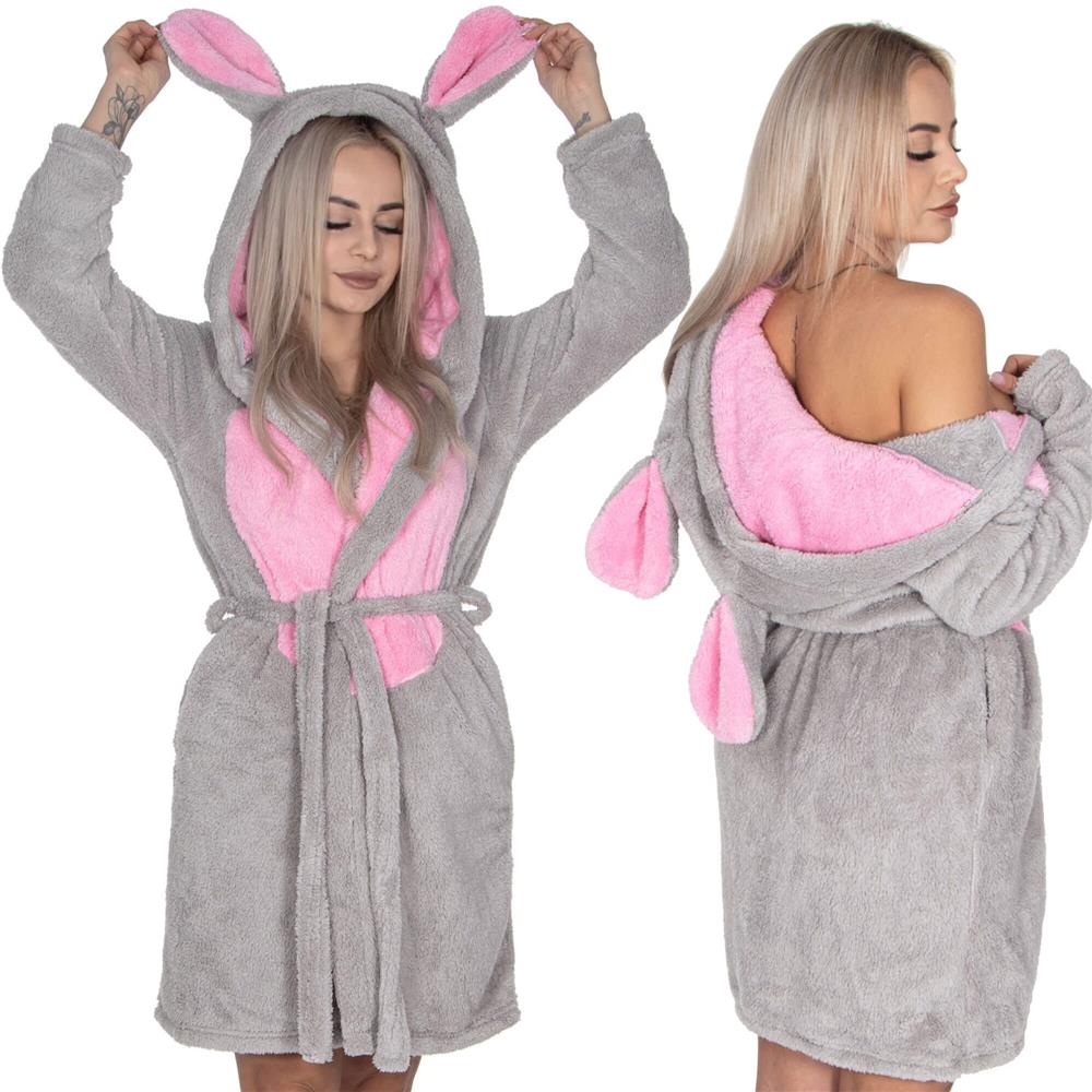 Halat de baie damă până la genunchi, cu glugă cu urechi, gri-roz, L/M