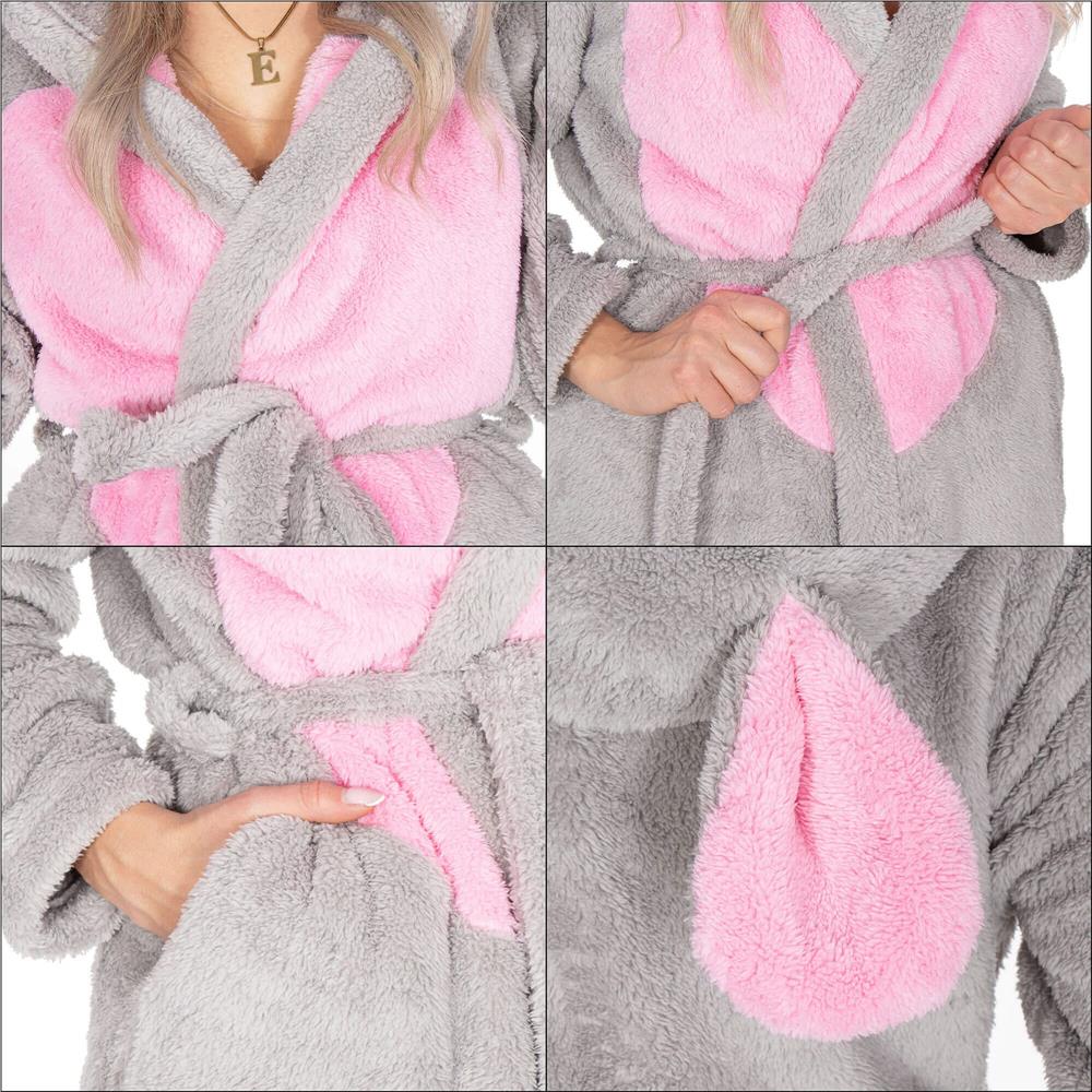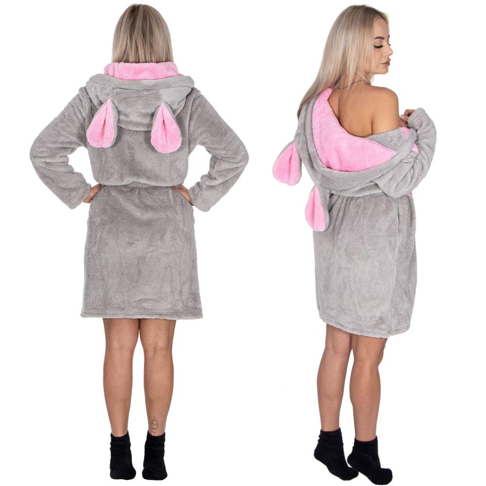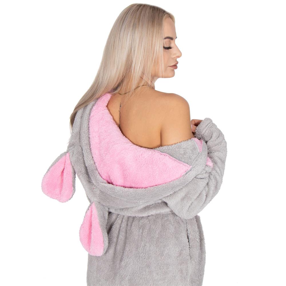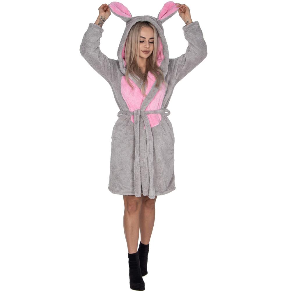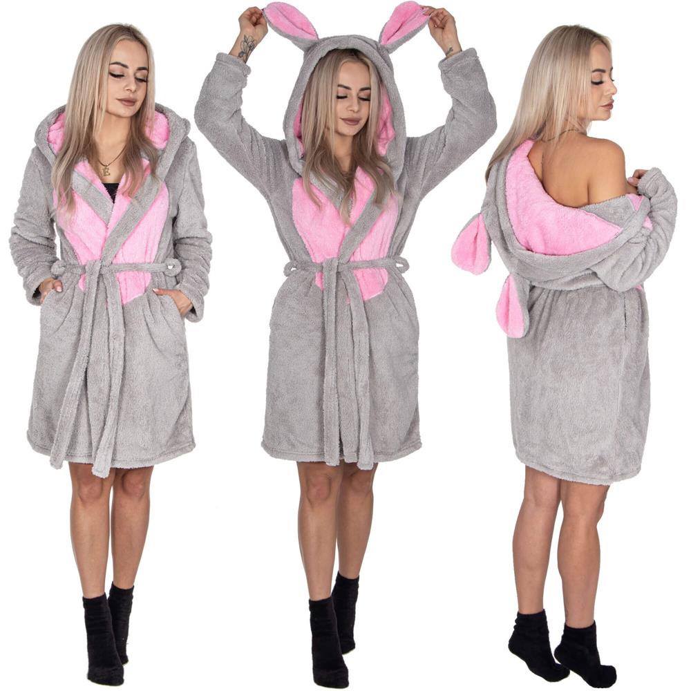 Halat de baie pentru femei pana la genunchi, gluga cu urechi , marimea L/M, gri si nuante de roz Household NewTrend