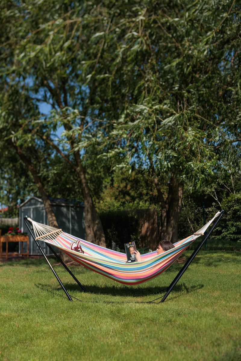 Hamacul de gradina Yulia este alegerea potrivita pentru momente de relaxare in aer liber, fie in gradina, in curte, la picnic sau in vacanta. Realizat din bumbac confortabil, acest hamac ofera o senzatie placuta la utilizare si un aspect vesel, datorita combinatiei de culori vii.
