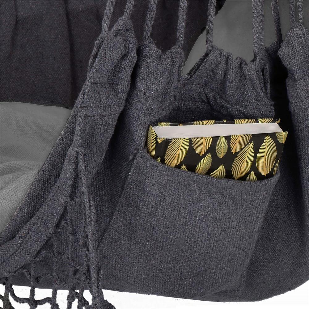Fabricat dintr-un amestec rezistent de bumbac si poliester, acest fotoliu suspendat pentru gradina este placut la atingere, dar si durabil in utilizare. Bara din lemn asigura sustinere buna, iar constructia solida suporta o greutate de pana la 150 kg. In plus, buzunarul lateral este foarte practic pentru telefon, carte sau alte obiecte mici pe care vrei sa le ai la indemana.