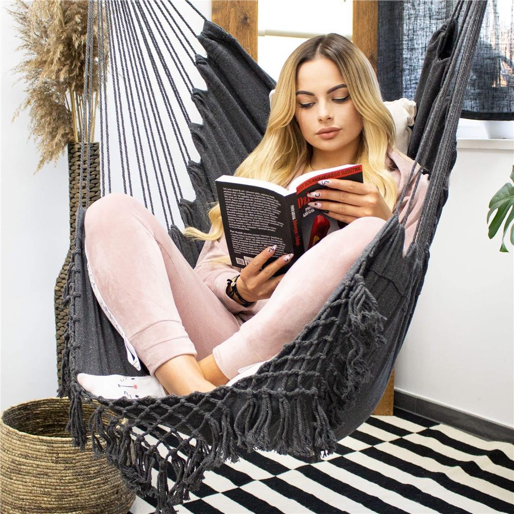 Bucura-te de momente de relaxare oriunde alegi cu acest hamac suspendat tip leagan, potrivit atat pentru interior, cat si pentru exterior. Designul sau modern in nuanta gri se integreaza usor in decorul din living, camera copiilor, terasa sau gradina. Sezutul confortabil, spatarul moale si cele 2 perne incluse ofera o experienta placuta de odihna, lectura sau relaxare dupa o zi lunga.