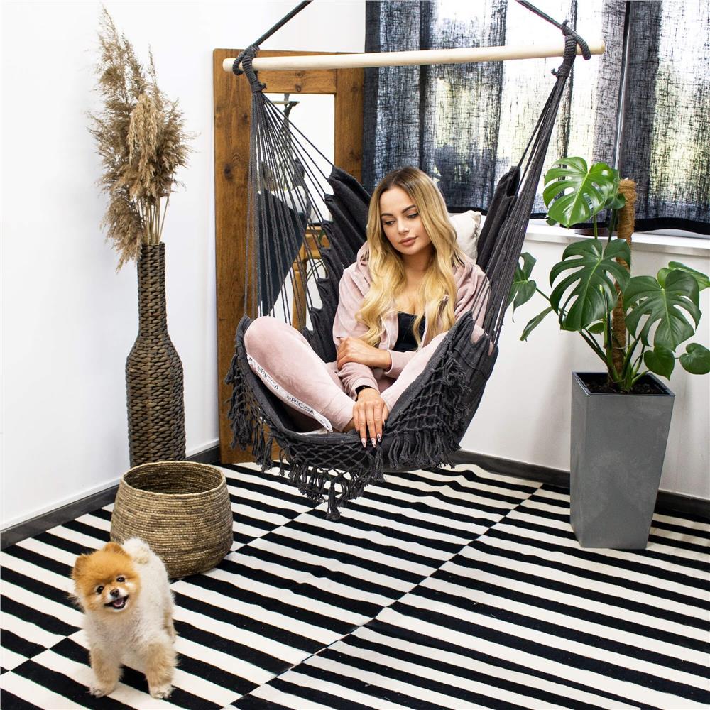 Este usor de montat, transportat si depozitat, fiind o alegere inspirata pentru acasa, vacante, camping sau picnic. Datorita dimensiunilor compacte si materialelor rezistente, acest scaun hamac suspendat combina confortul cu functionalitatea intr-un singur produs.