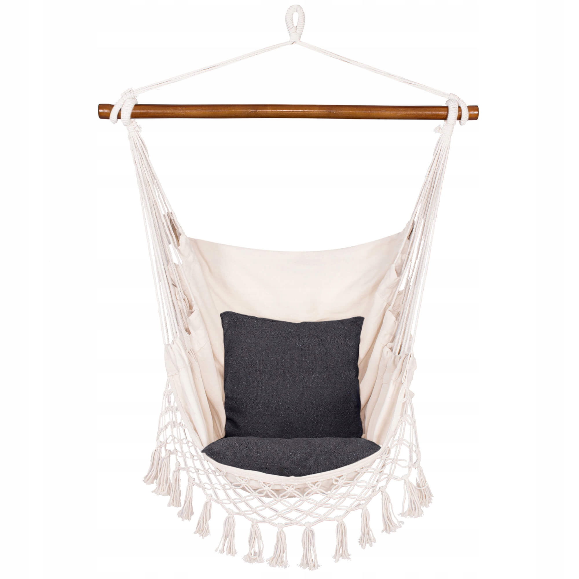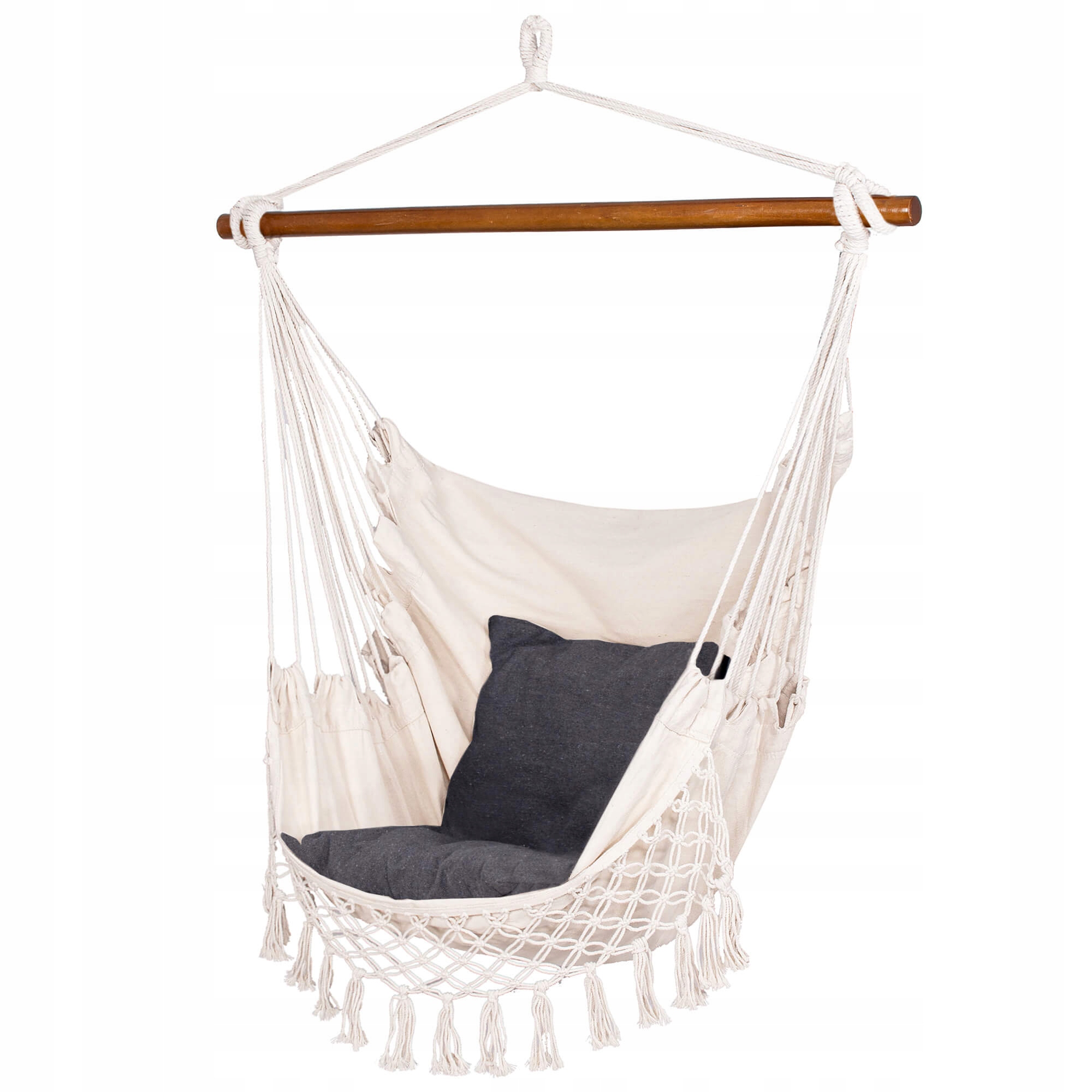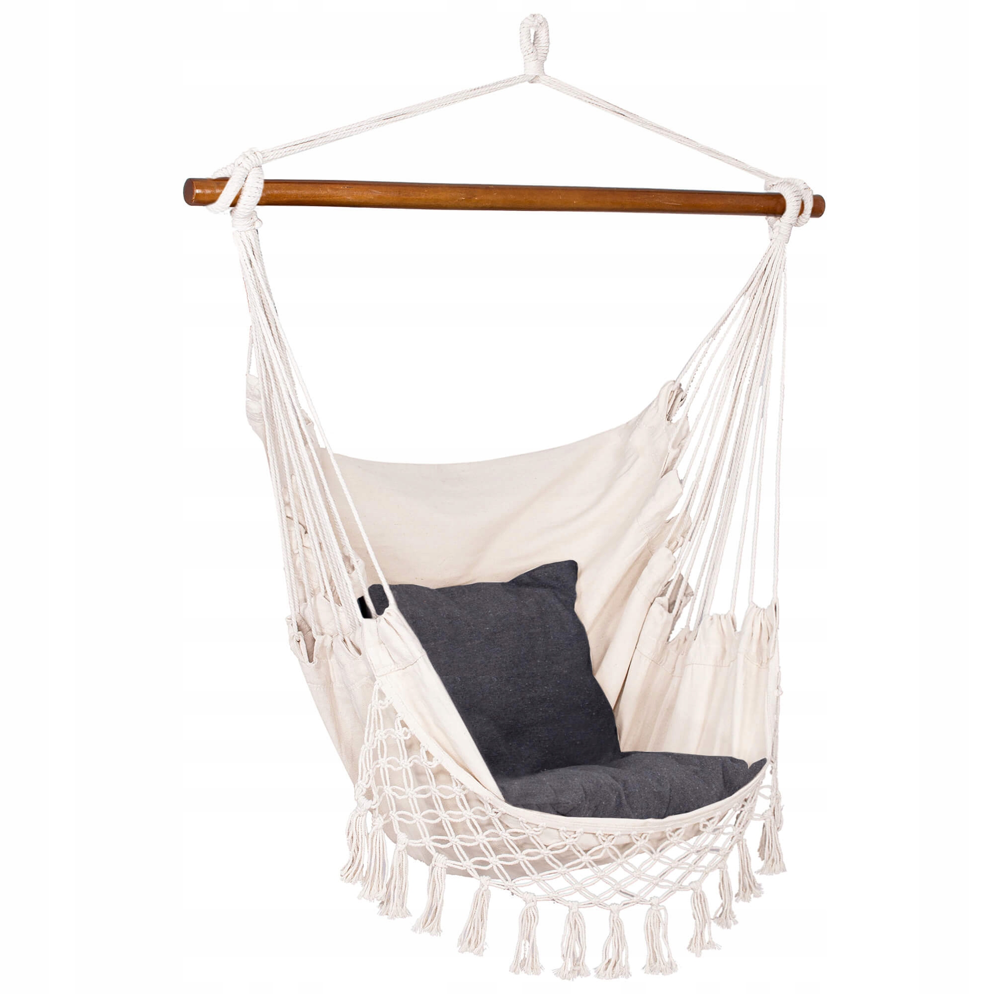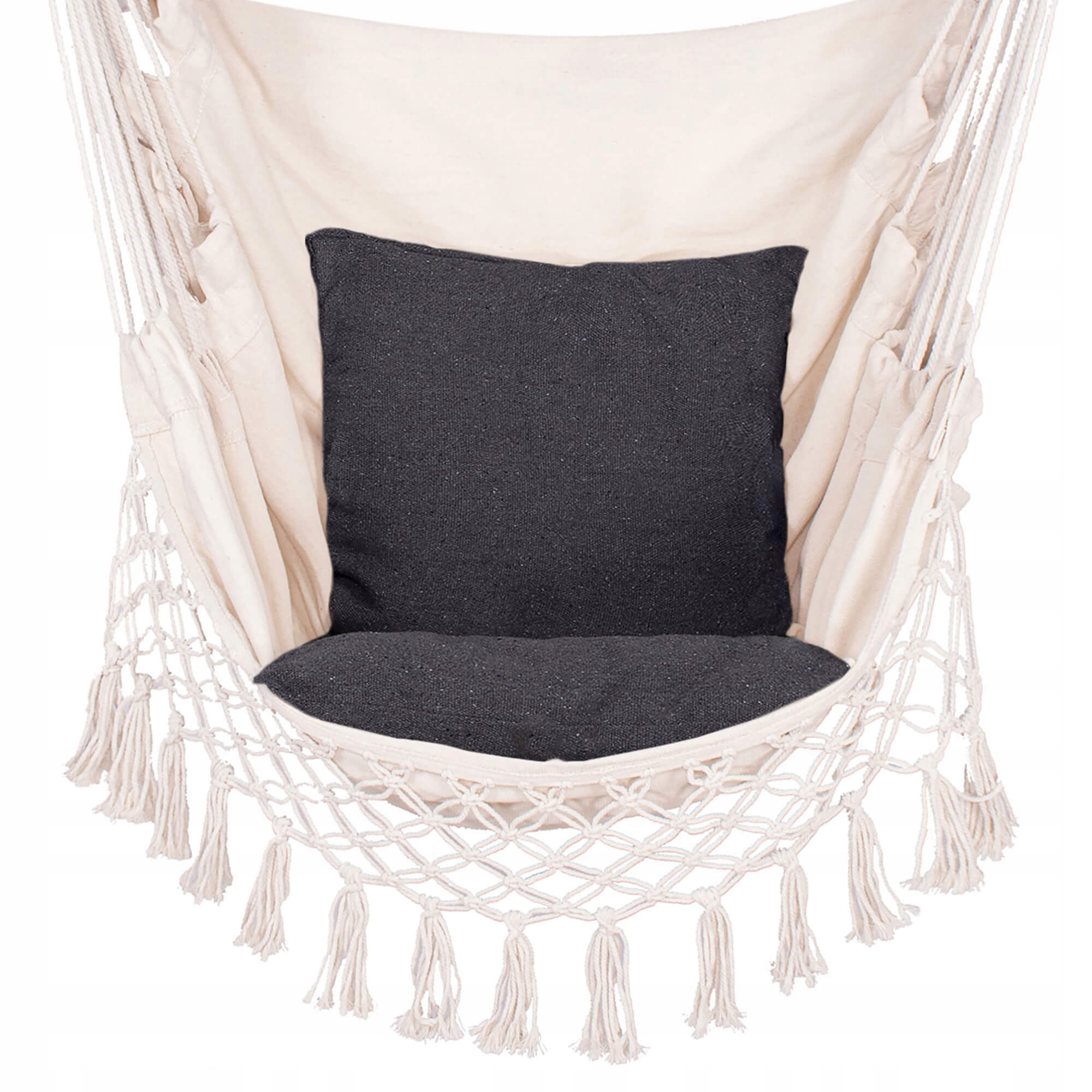 Bucura-te de momente de relaxare oriunde iti doresti cu acest hamac suspendat tip scaun HM19, potrivit atat pentru interior, cat si pentru exterior. Designul sau boem, completat de 2 perne confortabile, franjuri decorative si material placut la atingere, transforma orice colt din casa, terasa, balconul sau gradina intr-un spatiu primitor. Materialul rezistent din bumbac si poliester ofera un echilibru excelent intre confort, durabilitate si circulatie buna a aerului.