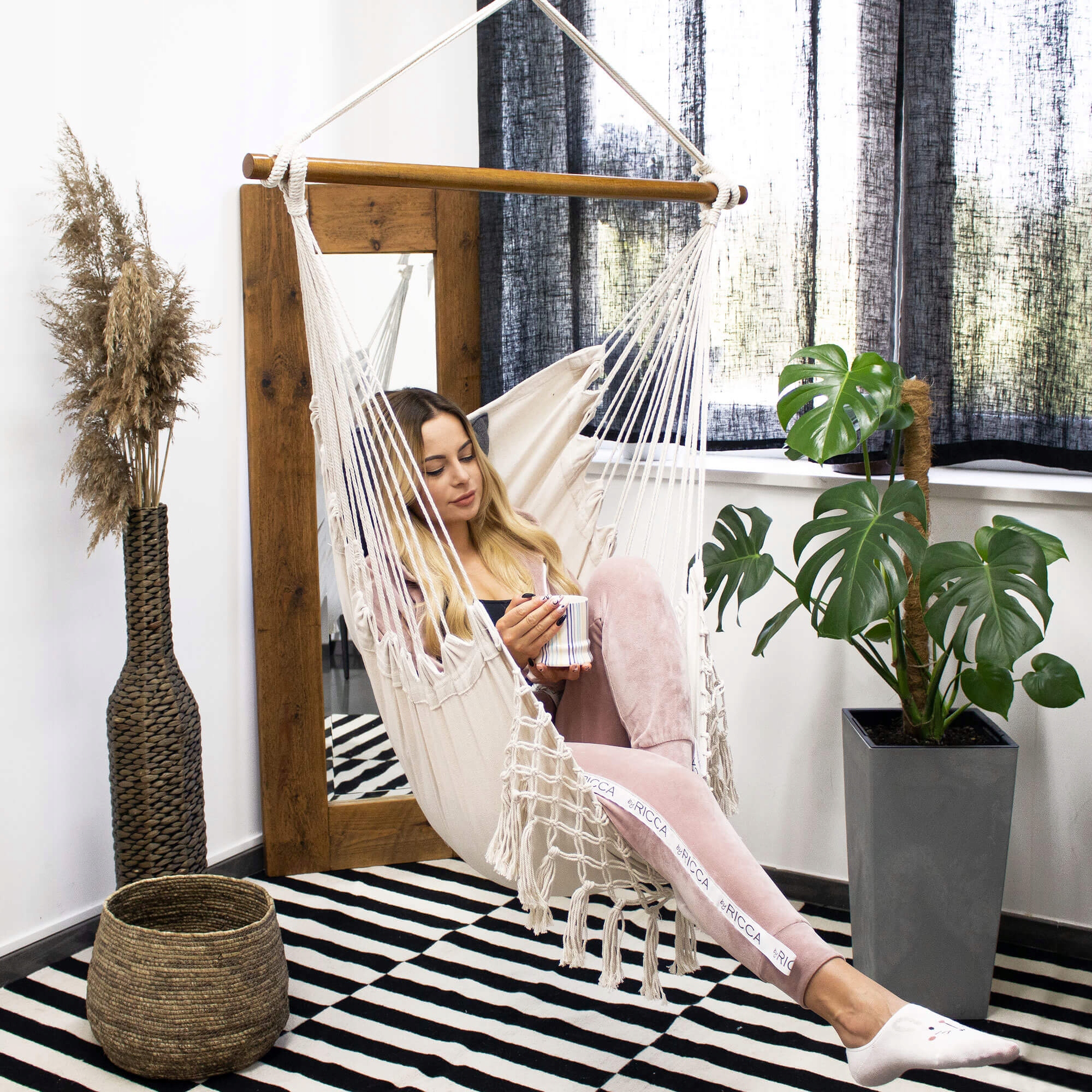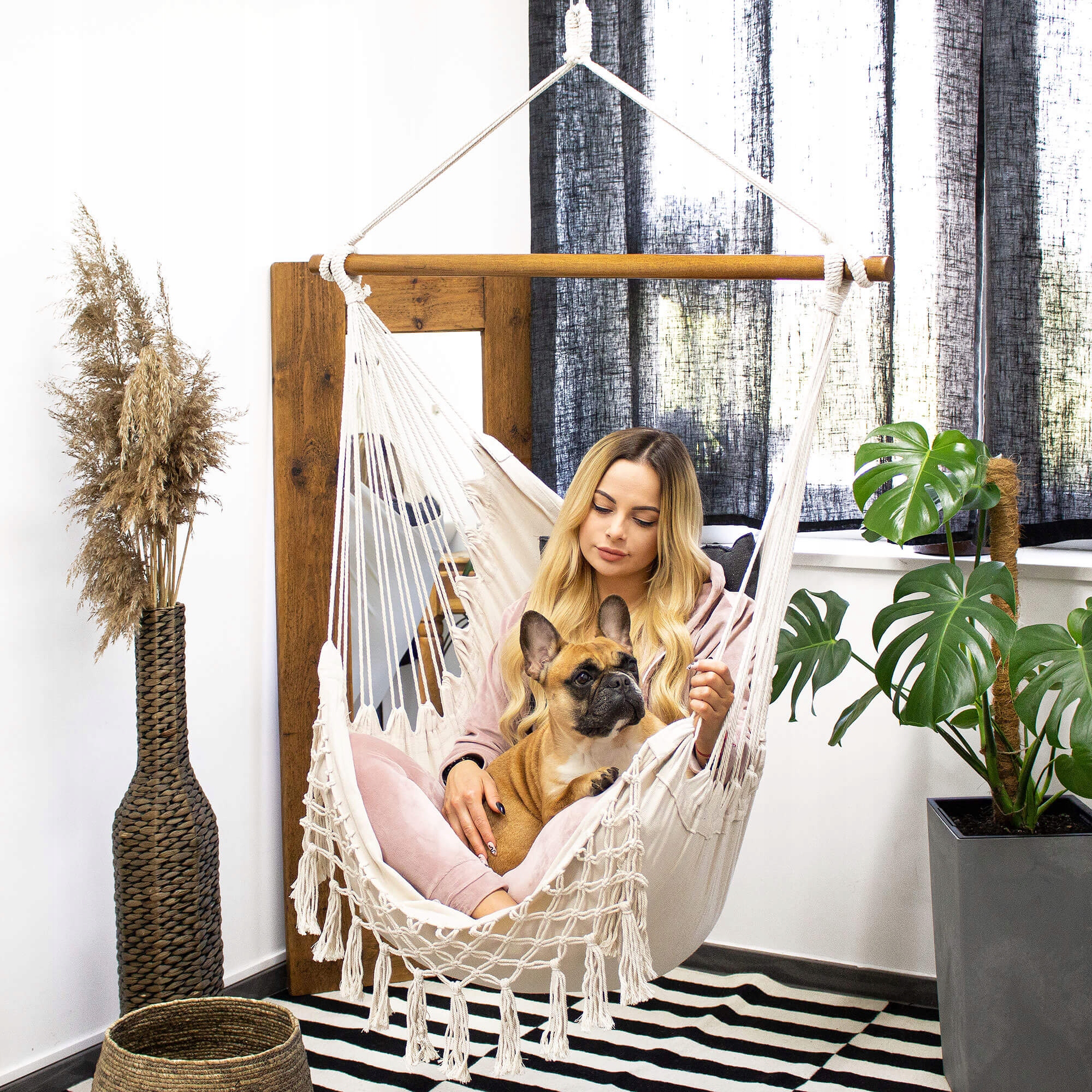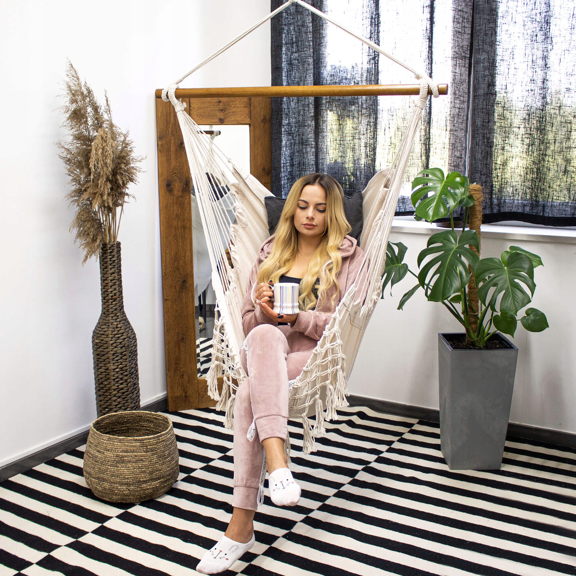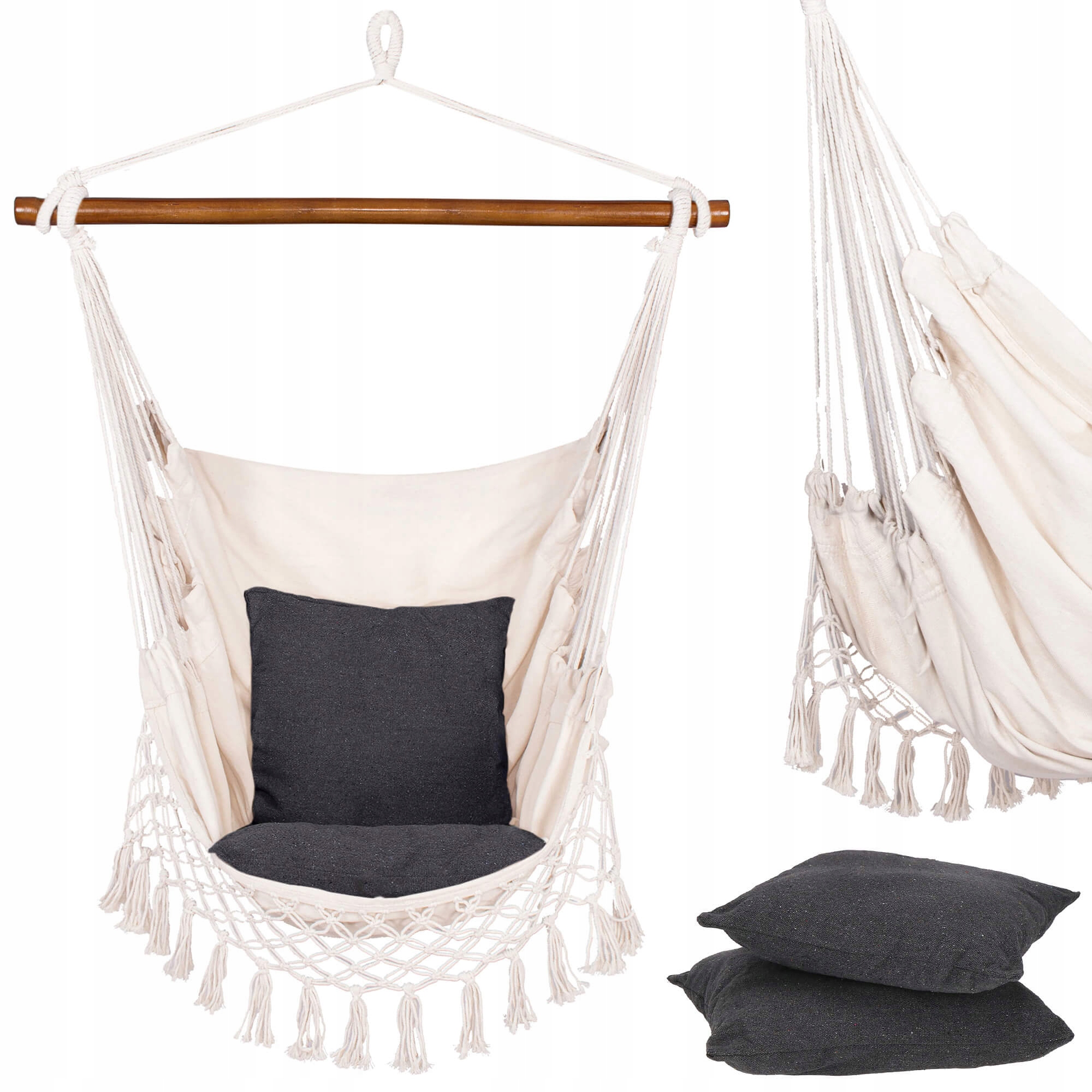 Monteaza hamacul tip leagan suspendat pe un suport sigur, tavan rezistent, grinda sau alt sistem de prindere adecvat. Este ideal pentru relaxare zilnica, lectura, pauze de odihna sau pentru amenajarea unui colt de relaxare elegant si confortabil.