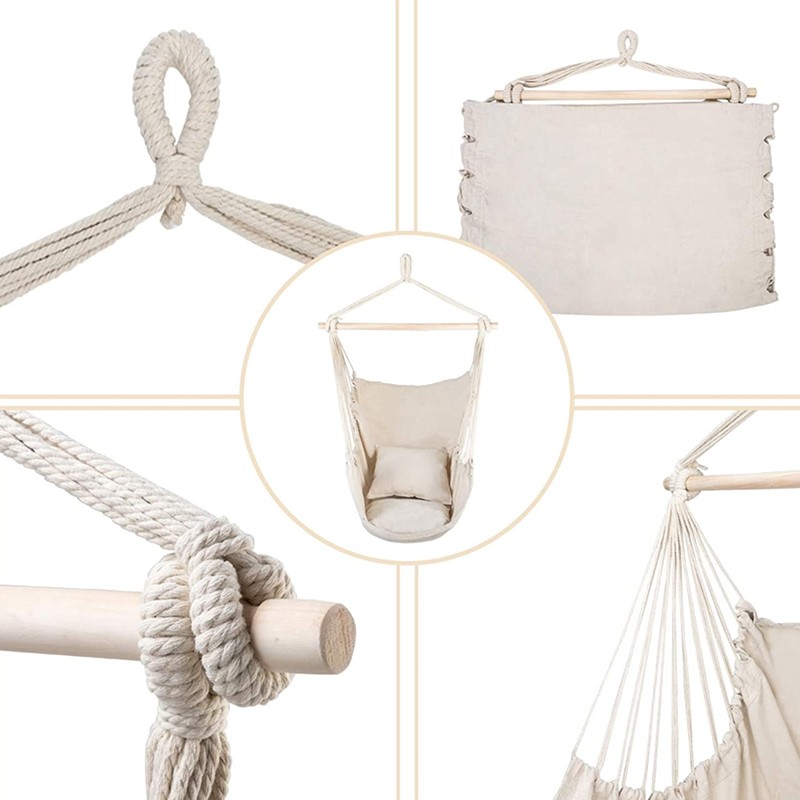 Hamac tip scaun bej 100x130 cm cu 2 perne si bara din lemn, 150 kg