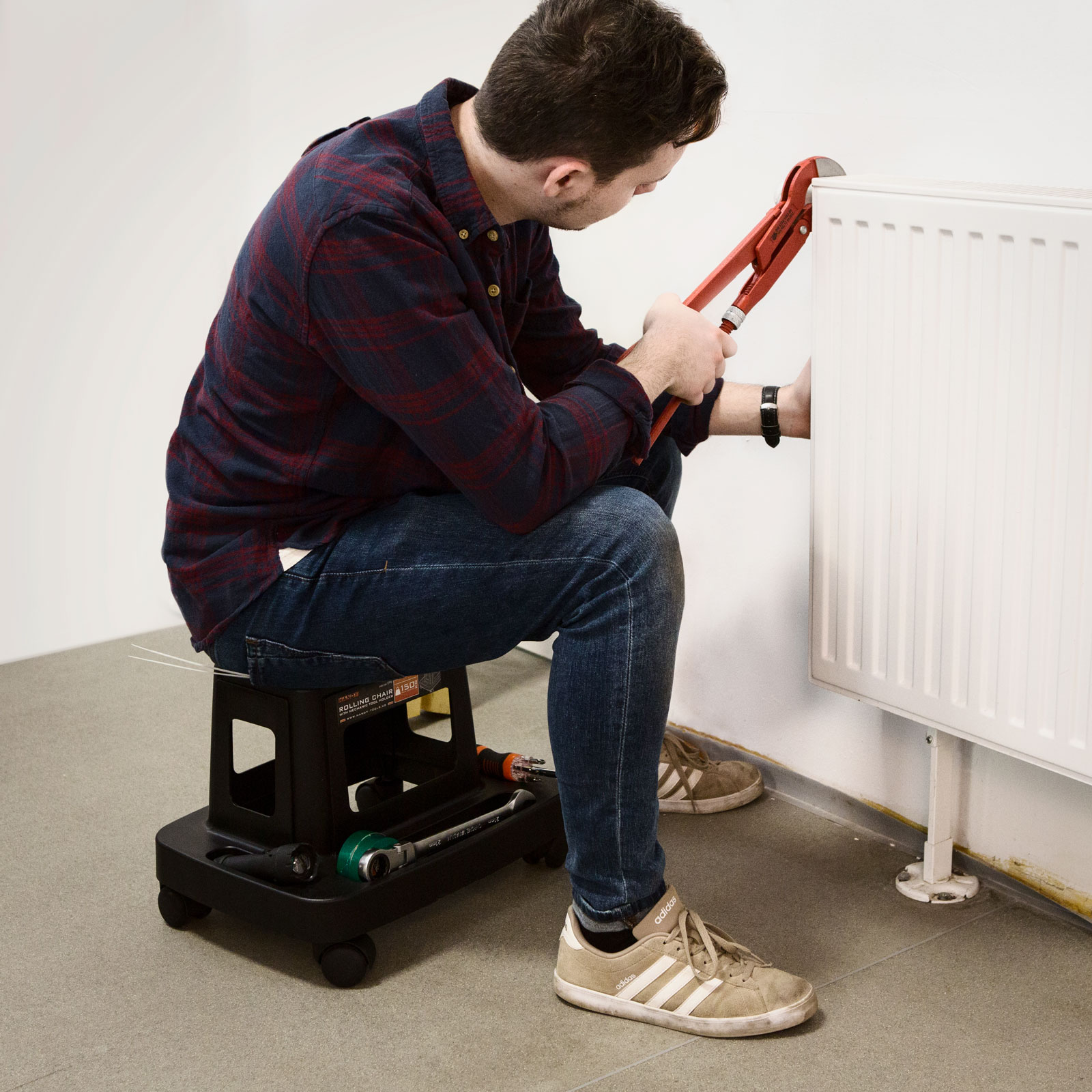 Datorită acestui scaun de lucru pe rotile, munca va fi cât se poate de comodă și ușoară. În timpul lucrului poți avea la îndemână toate sculele, piesele, șuruburile sau accesoriile de care ai nevoie – astfel nu mai este necesar să te ridici pentru oricare din acestea. Partea de sus a scaunului îți permite să te așezi. Este o opțiune perfectă atunci când trebuie să stai pe genunchi sau să te apleci pe diferite suprafețe.
