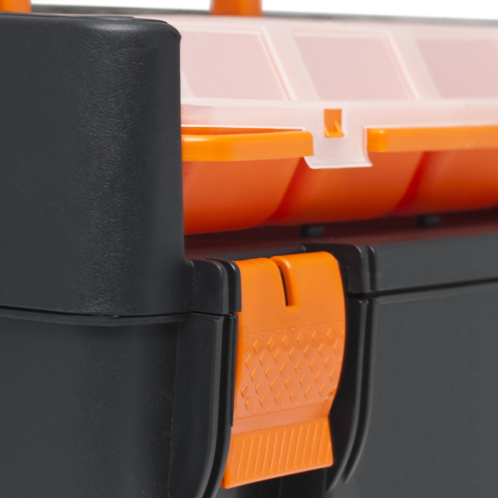Un compartiment mare în interior (plus 4 compartimente mai mici) și un sertar independent (detașabil cu 4 compartimente fixe și capac transparent), în care poți depozita atât unelte mai mari, cât și elemente mai mici precum articole de pescuit, lego, accesorii electrice, ș.a.m.d..