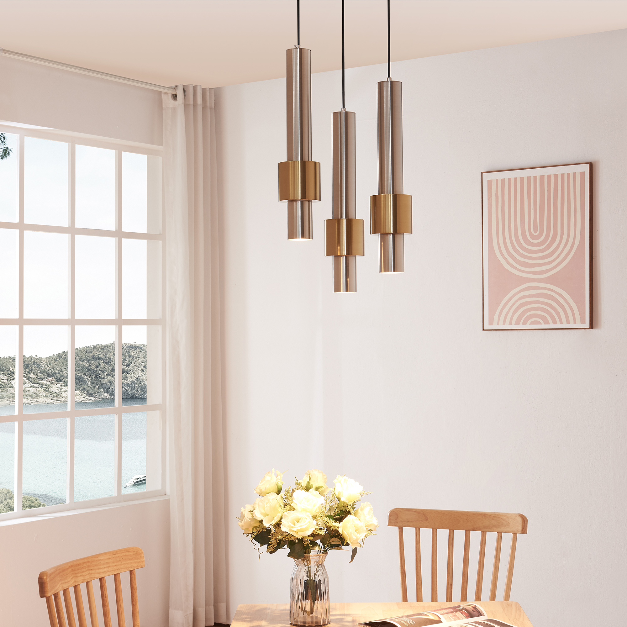 Die Pendelleuchte verfügt über drei ästhetische Lampenschirme, die sich nahtlos in das Gesamtdesign der Leuchte einfügen. Jede Lampenfassung hält ihr jeweiliges Leuchtmittel sicher an seinem Platz und garantiert eine zuverlässige Funktion.