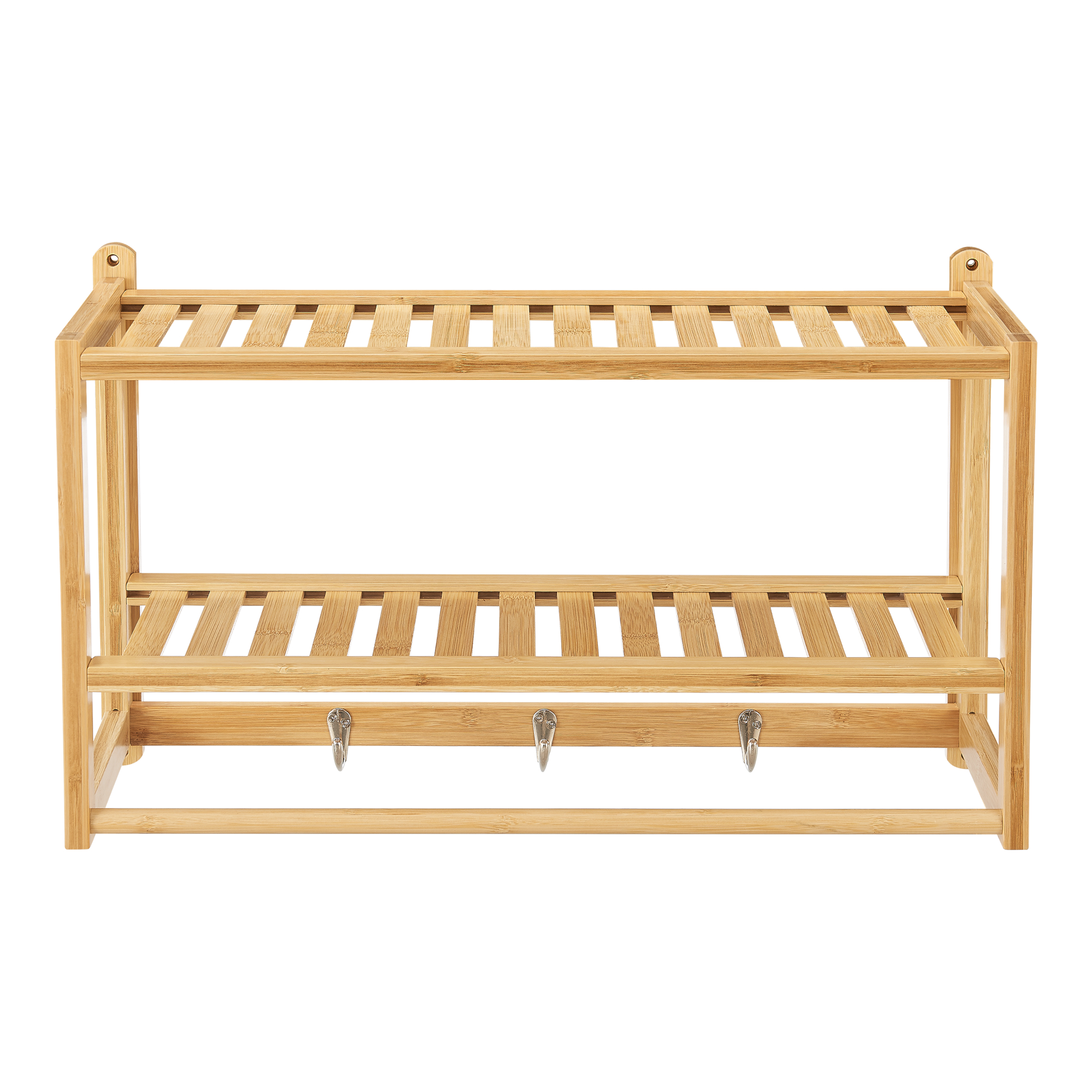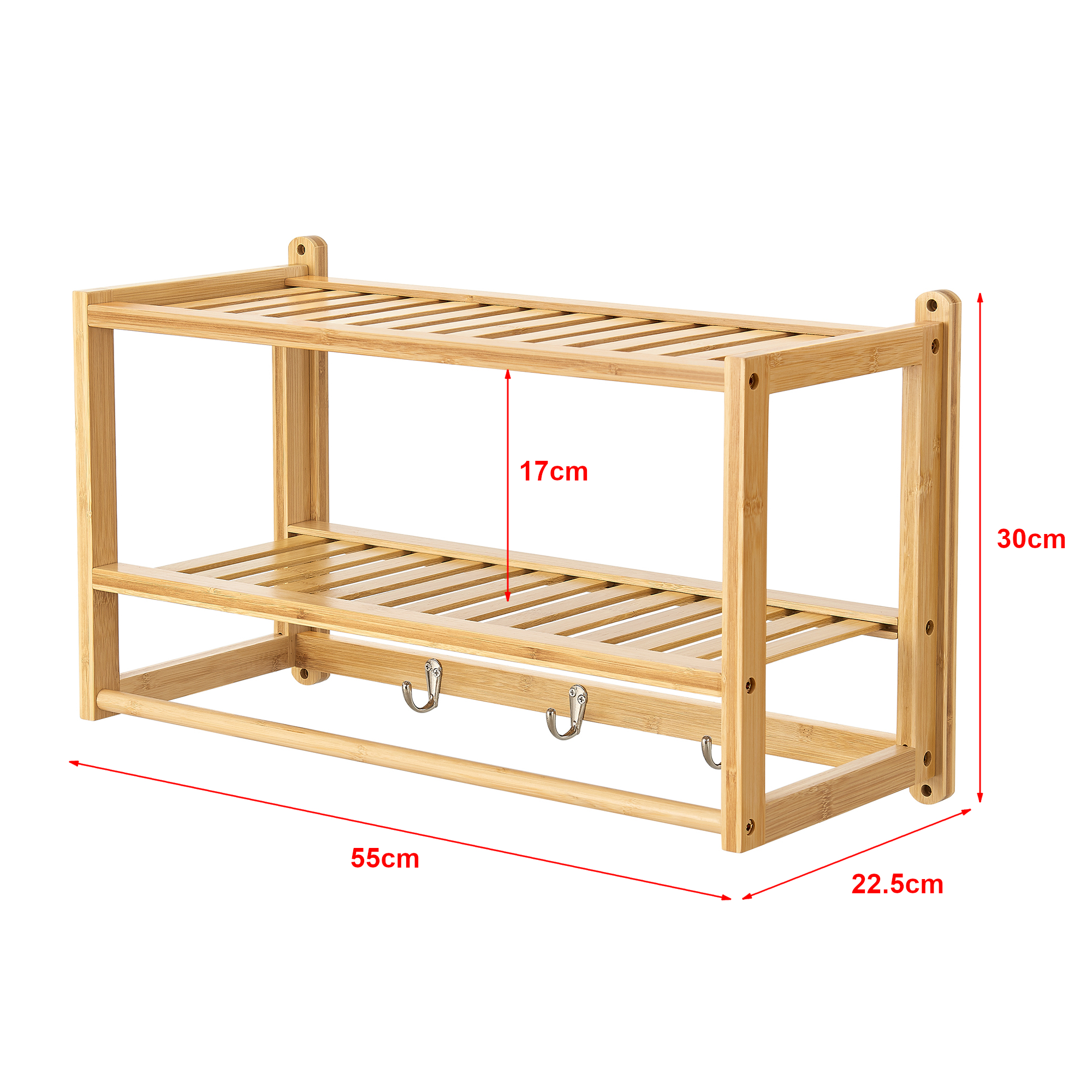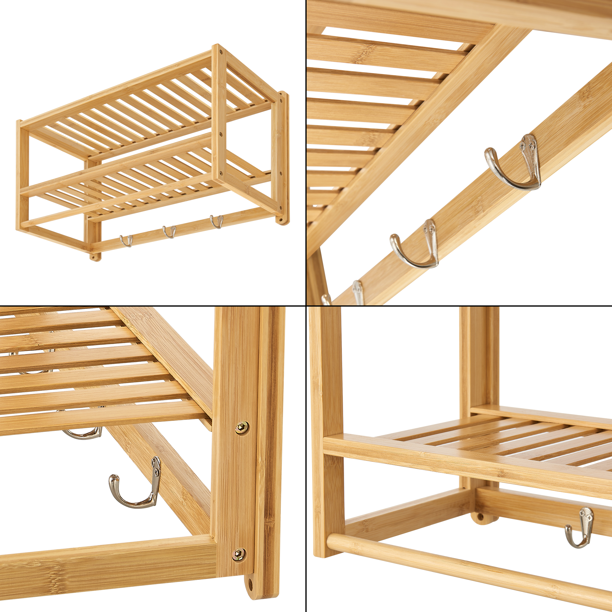 Darüber hinaus bietet die nachhaltige Bambuskonstruktion drei Haken, an denen Sie Jacken, Bademäntel, Geschirrtücher und viele andere Objekte aufhängen können. Dadurch haben Sie Ihre wichtigsten Dinge immer griffbereit.