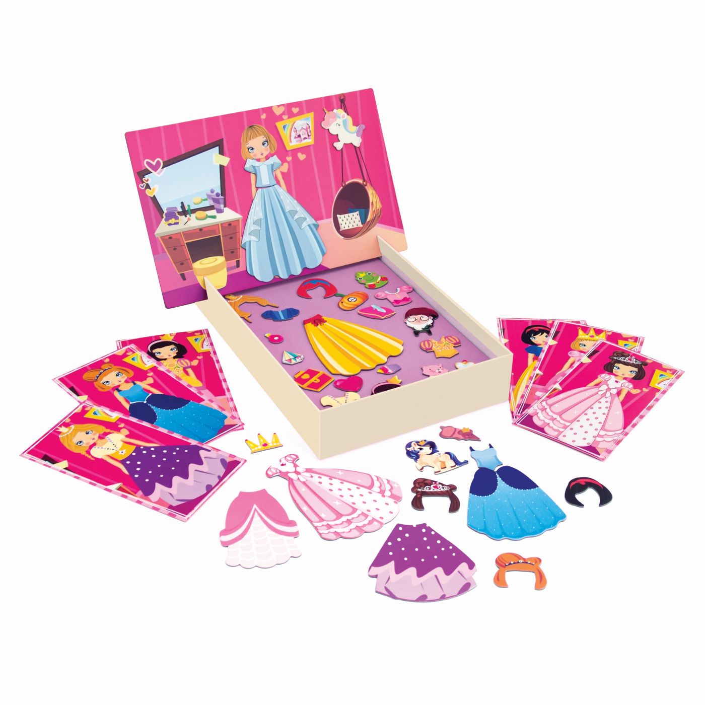 Printesele te invita intr-o lume plina de culoare si fantezie! Combina cele 34 de piese din carton cu magneti rochii, coafuri si accesorii pentru a crea cele mai frumoase printese. Poti urma modelele de pe cele 7 carti incluse sau iti poti lasa imaginatia libera si sa creezi propriile tale tinute regale. Jocul ofera multiple posibilitati de joaca prin imitatie, stimuland creativitatea, atentia si coordonarea copiilor. Te poti juca impreuna cu prietenii sau parintii, inventand povesti magice despre printesele tale preferate. Poti chiar sa masori rochiile si accesoriile sau sa le desenezi contururile pe hartie pentru a le colora. O activitate educativa si creativa care ii tine pe copii departe de ecrane si le ofera ore intregi de distractie imaginativa. Contine 34 de magneti din carton, 1 plansa magnetica.