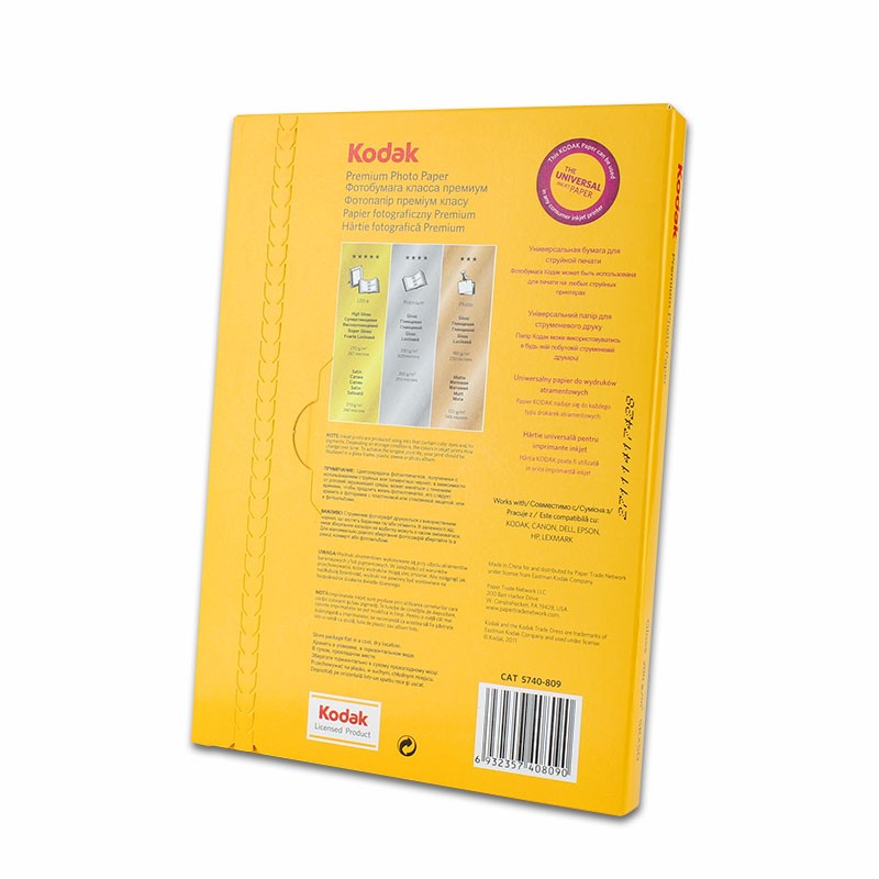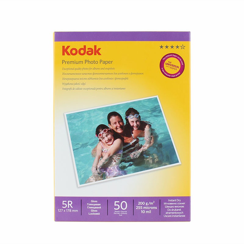 Topul de hartie Foto Kodak contine 50 de coli cu suprafata lucioasa, format 5R cu greutate de 200 de grame/mp. Cu aceasta hartia originala Kodak 13x18 cu greutatea de 200g se pot imprima fotografii la rezolutie mare de calitate superioara.