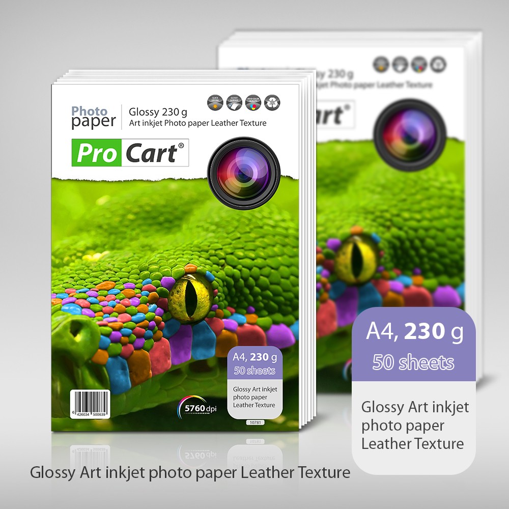 Hartie FOTO cu textura lucioasa de piele format A4 230 gr este un tip de hartie FOTO a carei suprafata imita pielea. Fotografiile printate pe aceste coli de hartie par a fi printate direct pe piele, hartia avand textura de piele.