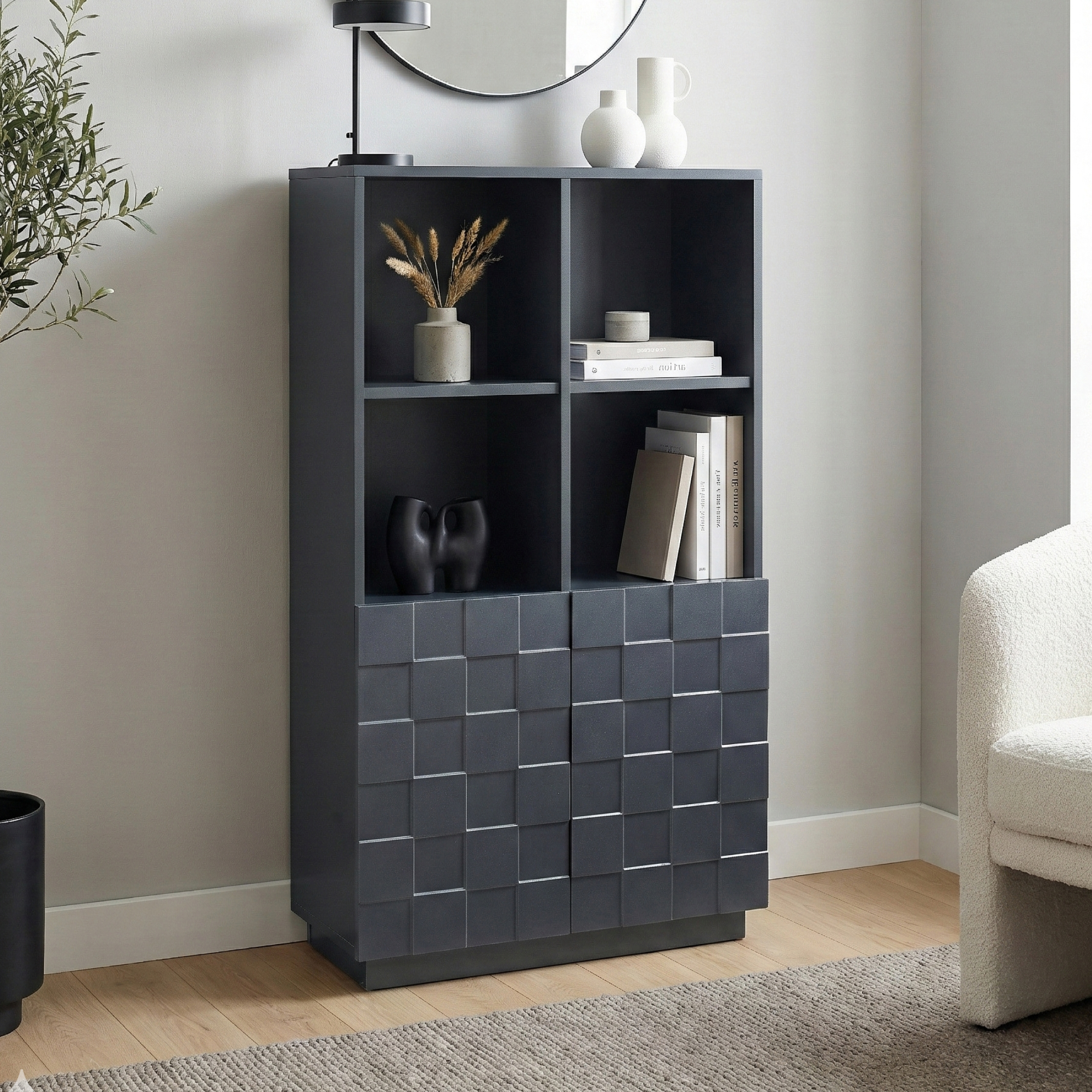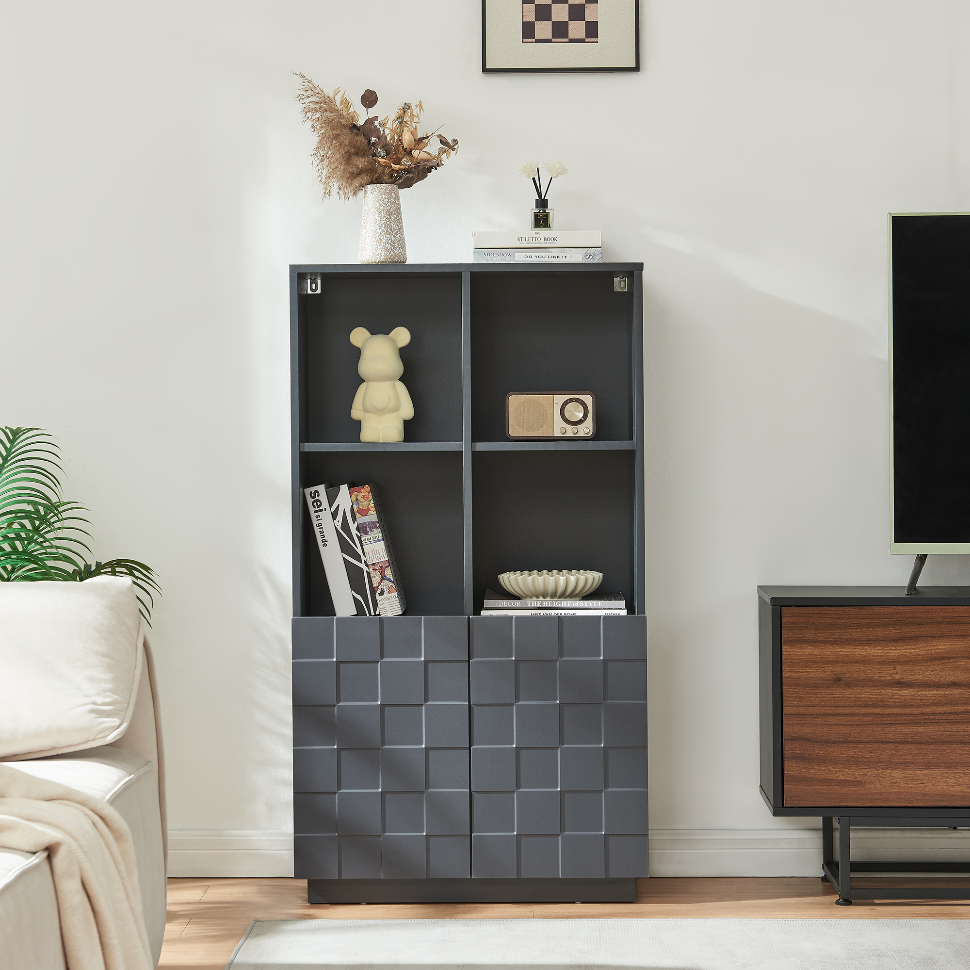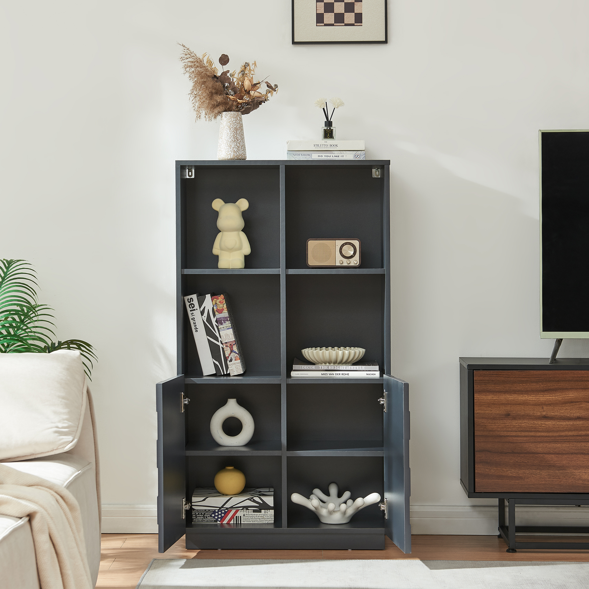 Hinter den beiden Türen stehen Ihnen vier übersichtlich angeordnete Fächer zur Verfügung, ideal für Bücher, Geschirr, Gläser oder Unterlagen. Vier offene Ablagefächer im oberen Bereich bieten zusätzlichen Platz für Dekoration, Pflanzen oder persönliche Lieblingsstücke.
