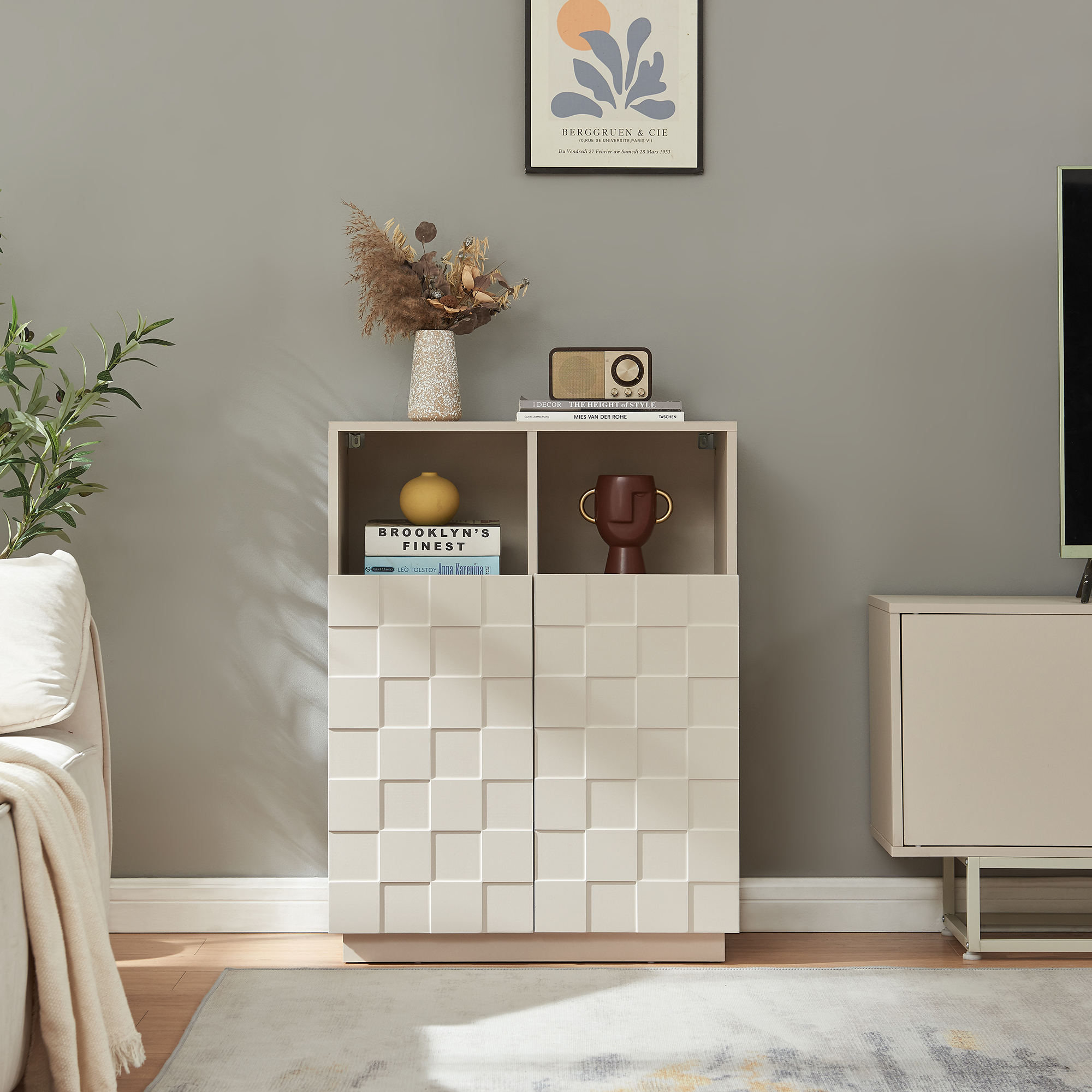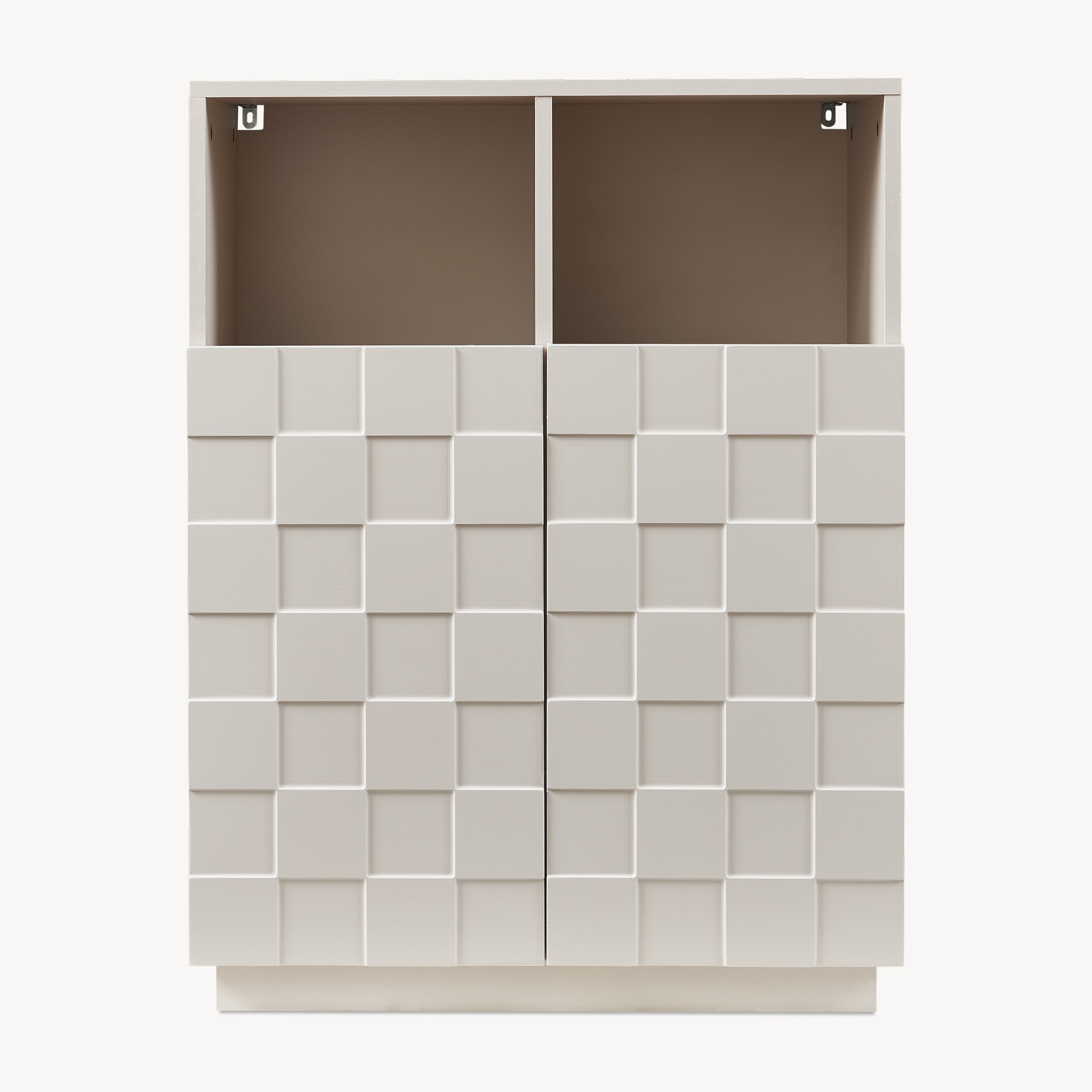 Diese Highboard-Kommode verbindet modernes Design mit praktischem Stauraum für Ihr Zuhause. Zwei Türen mit dekorativer 3D-Front verleihen ihr eine besondere Ausstrahlung und setzen einen stilvollen Akzent im Wohnraum.