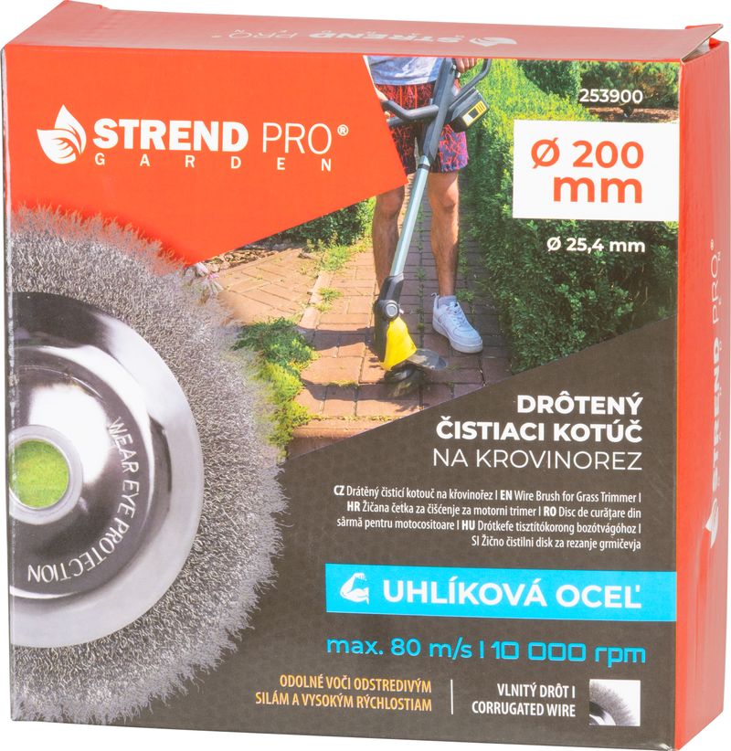 Drôtená hlava Strend Pro Gardenje výkonný čistiaci nadstavec na krovinorez určený na odstraňovanie buriny, machu, nečistôt a usadenín z betónových, kamenných a zámkových plôch. Vďaka priemeru200 mma montážnemu otvoru25,4 mmje kompatibilná s väčšinou bežných krovinorezov.