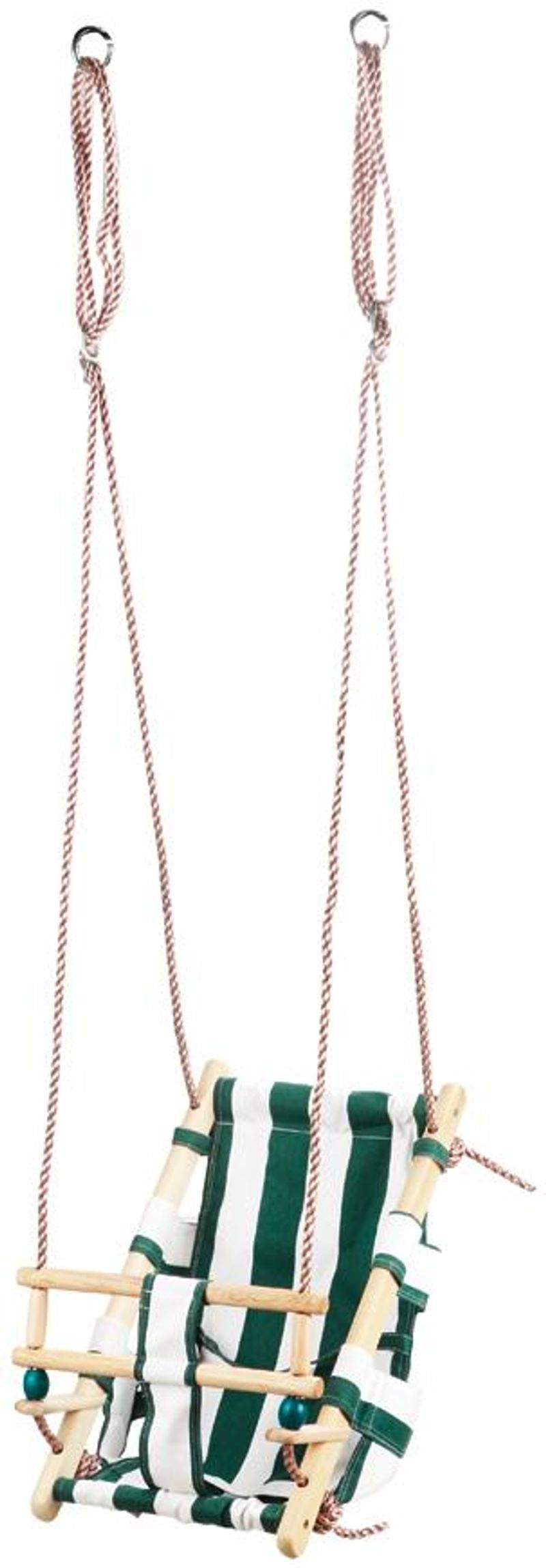 Plátená detská hojdačka zelenej farby je prispôsobená pre tých najmenších. Vďaka svojmu polo-ležatému tvaru do nej jednoducho dieťa uložíte. V prednej časti hojdačky sa nachádza drevená zábrana voči vypadnutiu. Drevené časti sa pre spevnenie celej hojdačky nachádzajú aj po bokoch sedacej časti. Na bokoch hojdačky sú umiestnené laná s priemerom 10 mm a dĺžkou 2 m. Potrebnú dĺžku lán si viete manuálne nastaviť a zauzliť. Na predom našrubované háky vložíte kovové oká na koncoch lán. Po tomto kroku je už možné bezpečne sa hojdať. Nosnosť je 70 kg a rozmery sú 36 x 24 x 45 cm.