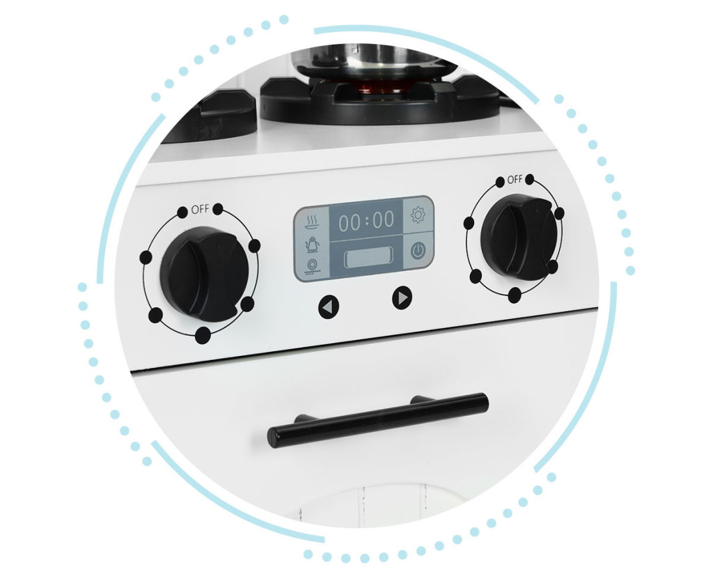 Bucătăria este dotată cu butoane care permit simularea funcționării aragazului și a cuptorului. Copiii pot controla temperatura, pot schimba setările arzătorului, ceea ce le permite să creeze diferite scenarii și să realizeze farfurii de joacă , fără riscul de a se arde. Aceasta este o oportunitate excelentă pentru joc creativ și experimentare într-un mediu sigur.