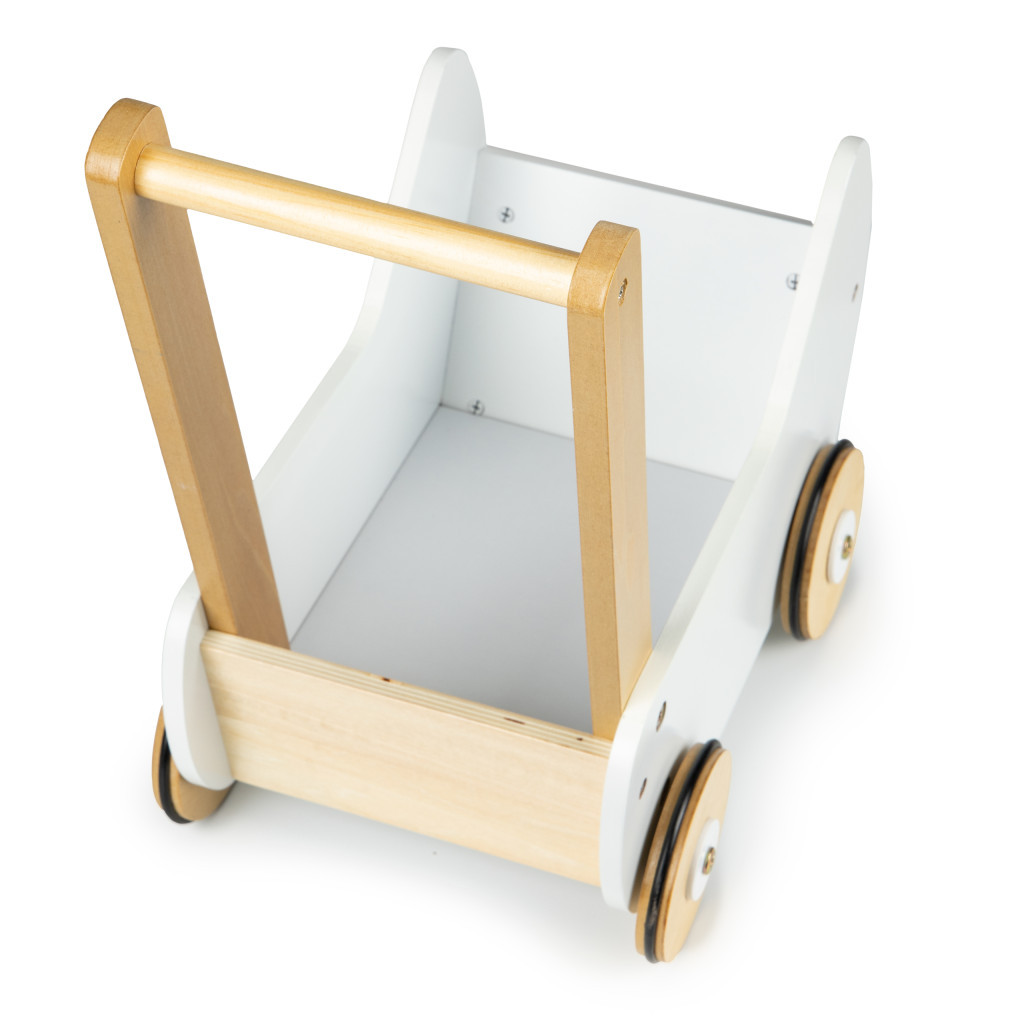 Construcția solidă din lemn este gândită pentru utilizare zilnică, iar roțile cu benzi antialunecare ajută la protejarea podelei și la o deplasare mai controlată. Mânerul este poziționat astfel încât copilul să poată împinge confortabil, menținând o postură corectă.
