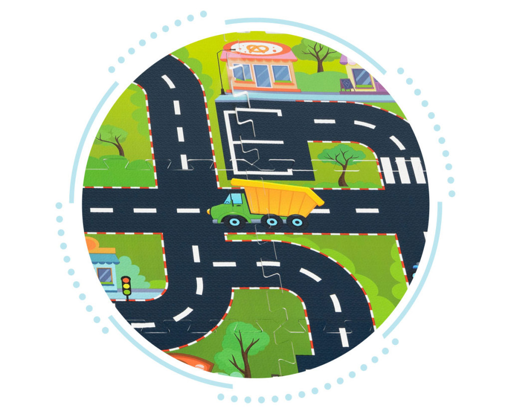.Covorul prezintă un model care înfățișează un oraș, drumuri și străzi. Datorită acestora, oferă o formă creativă și excelentă de divertisment pentru micii iubitori de mașini și vehicule . Fiecare detaliu este viu colorat și atent conceput pentru a încuraja copiii să exploreze și să interacționeze. Poate fi folosit pentru a învăța să meargă, să se târască, să se odihnească sau ca pătură de picnic .