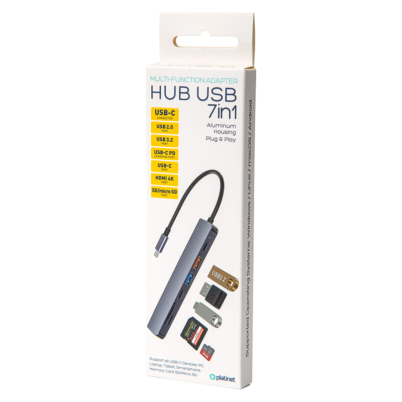 - Extensie cu 7 porturi: Include USB 3.2, USB 2.0, HDMI 4K, USB-C PD (Power Delivery), sloturi pentru carduri SD și MicroSD, oferind funcționalitate completă într-un singur hub.
