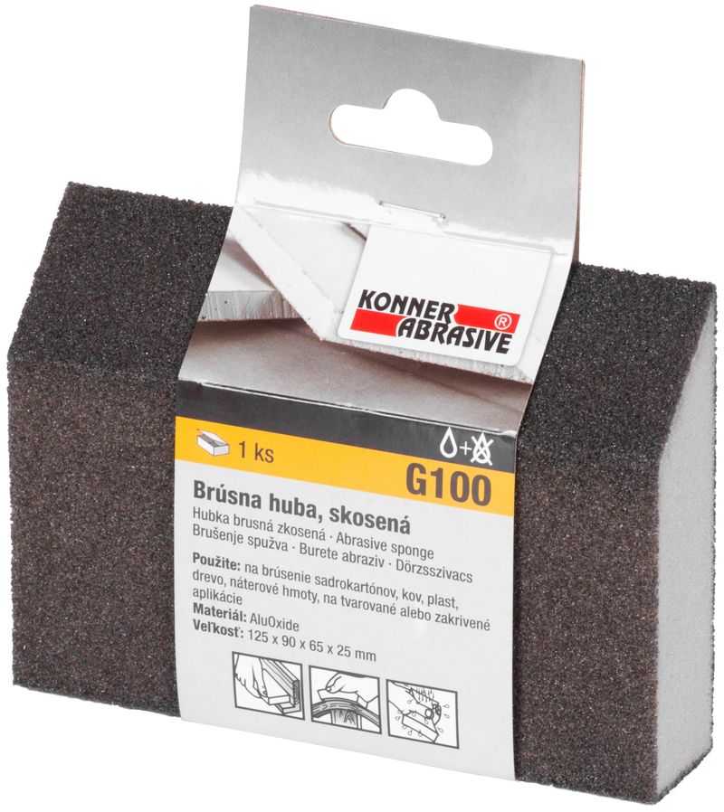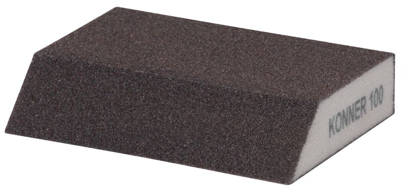 Skosená brúsna huba KONNER je určená na brúsenie sadrokartónov, kovov, plastov, dreva, náterov na tvarované alebo zakrivené aplikácie. Rozmery: 125x90x65x25 mm. Zrnitosť: G100 - vhodná pre hrubé povrchy a predprípravu.Huba je vyrobená z AluOxidu. .