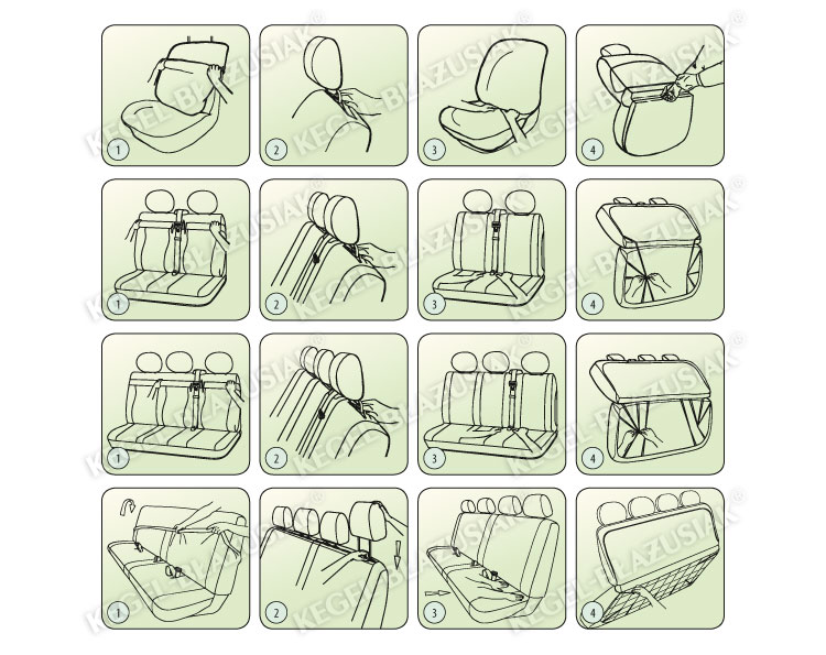 Setul are catarame din plastic, iar elementele de fixare au fost cusute in material, astfel incat husele pot fi puse cu usrinta pe baza instructiunilor din imagine atasata. Daca fotoliul este echipat cu o cotiera, un orificiu special in material va permite utilizarea acestuia. Exista un buzunar cusut in spatele husei scaunului pasagerului, care poate fi extrem de util.