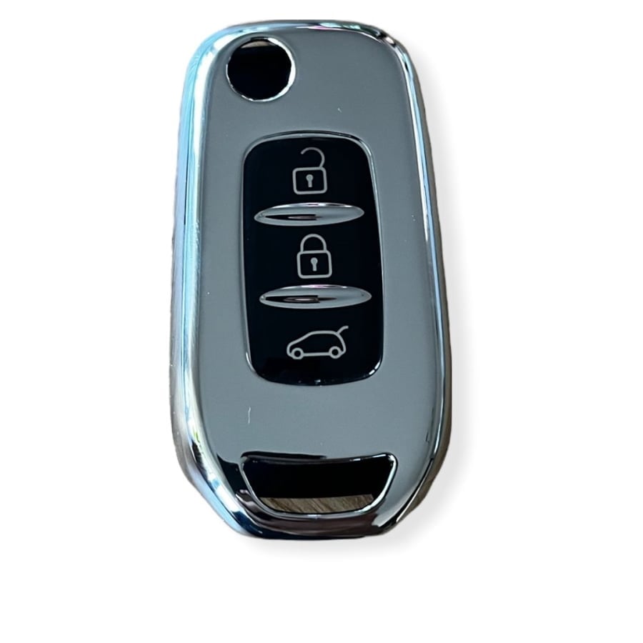 Husă cheie briceag Renault din TPU, finisaj silver, creată pentru un plus de protecție și un look modern. Se potrivește peste cheia ta și ajută la prevenirea zgârieturilor, urmelor de uzură și a alunecării din mână, păstrând butoanele ușor de apăsat.