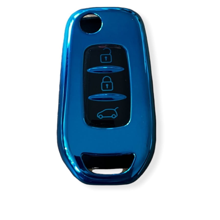 Husă pentru cheie Renault tip briceag, realizată din TPU cu finisaj lucios albastru, ideală pentru protecția zilnică a telecomenzii. Se potrivește pe cheile cu 3 butoane (blocare/deblocare/portbagaj) și îți oferă un plus de stil, fără să îngreuneze utilizarea.