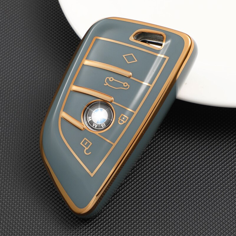 Husă cheie smartkey BMW Seria G (3/4 butoane), TPU+PC, gri cu contur auriu