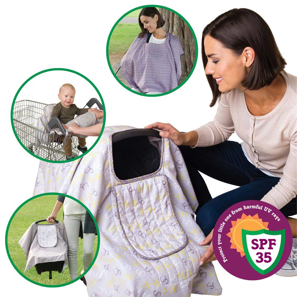 Husa de călătorie 3 în 1 Clevamama este un accesoriu practic și versatil pentru părinții care își doresc mai mult confort în deplasările zilnice. Poate fi folosită ca baldachin pentru scoica auto, poncho pentru alăptare și husă de protecție pentru căruciorul de cumpărături, oferind intimitate, protecție și igienă încă din primele luni de viață.
