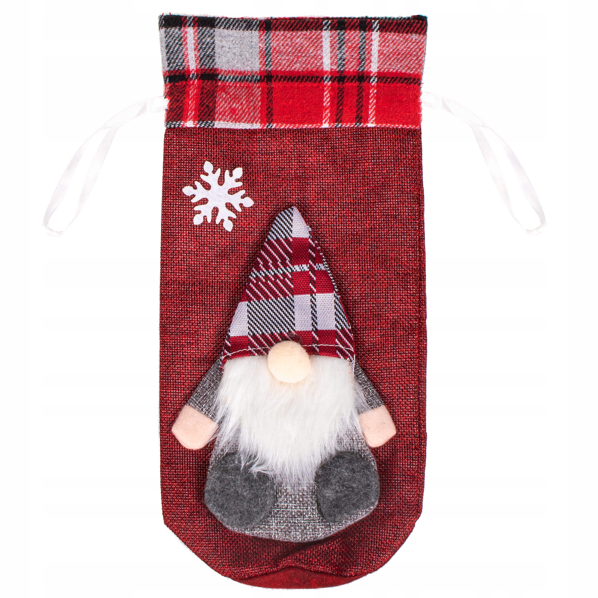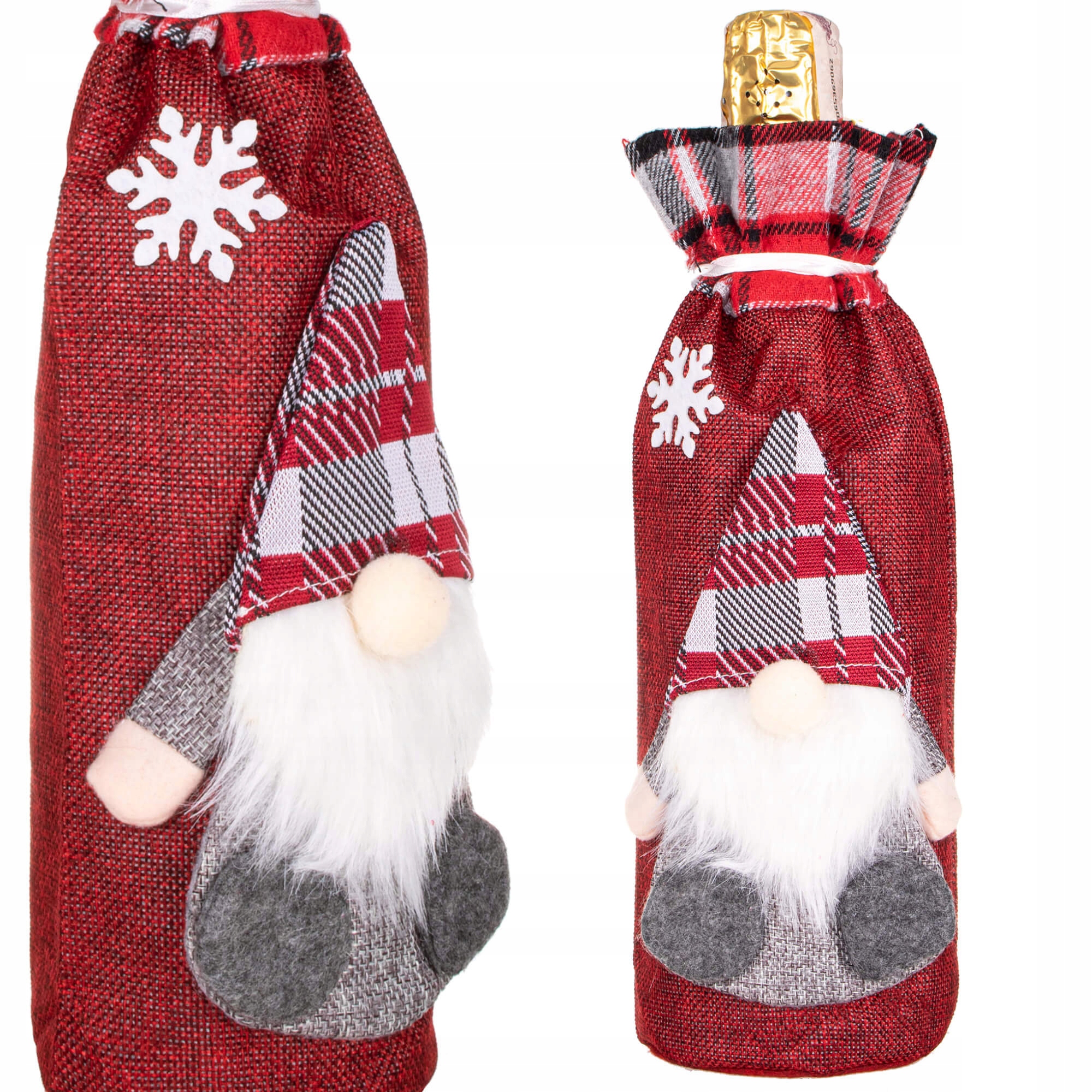 Adaugă un plus de farmec sărbătorilor cu această husă decorativă pentru sticlă de Crăciun, realizată în formă de gnom festiv. Este alegerea ideală pentru a transforma rapid o sticlă de vin, șampanie sau băutură festivă într-un decor elegant pentru masă, într-un cadou cu aspect special sau într-un accent decorativ de sezon.