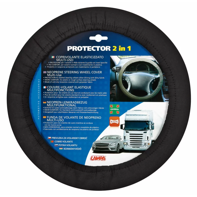 Alege această husă pentru volan 2 în 1 pentru un plus de protecție și confort la fiecare drum. Este ideală pentru a proteja volanul auto din piele atunci când conduci cu mâinile murdare și oferă o prindere mai plăcută pe volanele din plastic sau cu suprafețe aspre. Materialul din neopren antialunecare, acoperit cu țesătură din poliester, contribuie la o utilizare confortabilă și sigură.