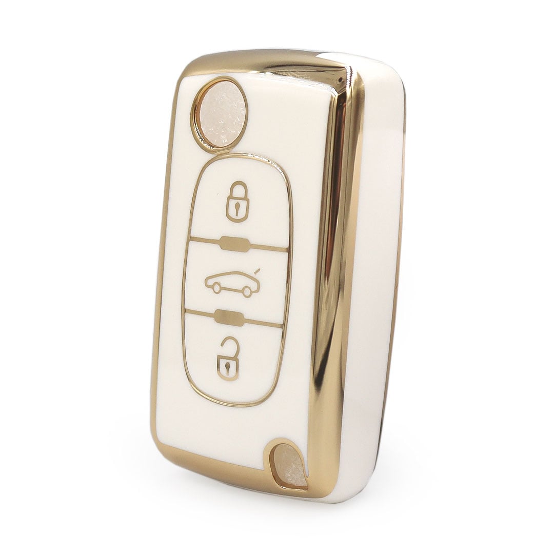 Husă pentru cheie briceag Peugeot 407 / Citroen C4 C5, TPU alb cu contur auriu, 3 butoane