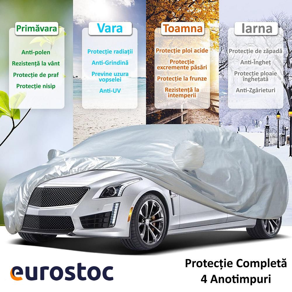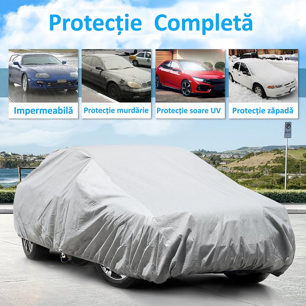 Husa/Prelata auto este fabricata din material premium de calitate superioara, prevazut cu doua straturi, exterior 100% impermeabil, rezistent la razele UV, si interior moale anti-zgarieturi. De asemenea, dispune de un sistem de prindere si fixare perfecta cu elastic asigurand o protectie impotriva vantului.