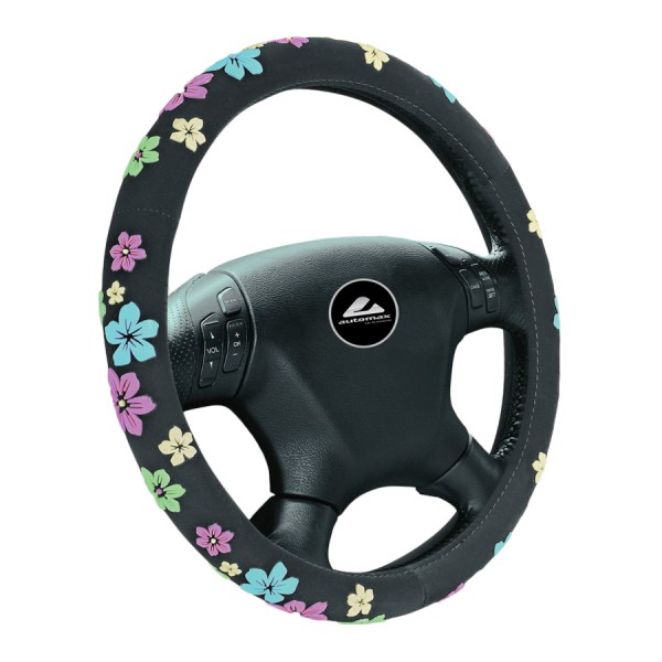 Husa volan de culoare neagra cu imprimeu floral, diametru 37-39cm, material textil, marca Automax AutoDrive ProParts