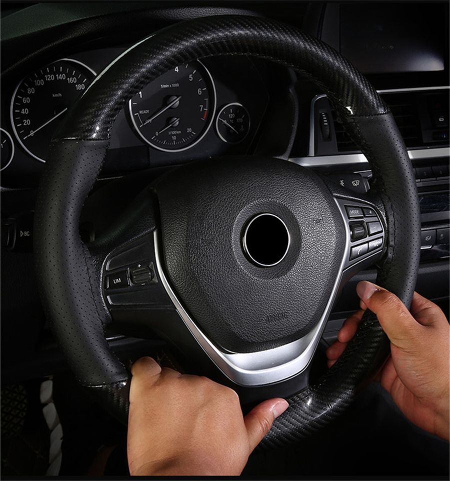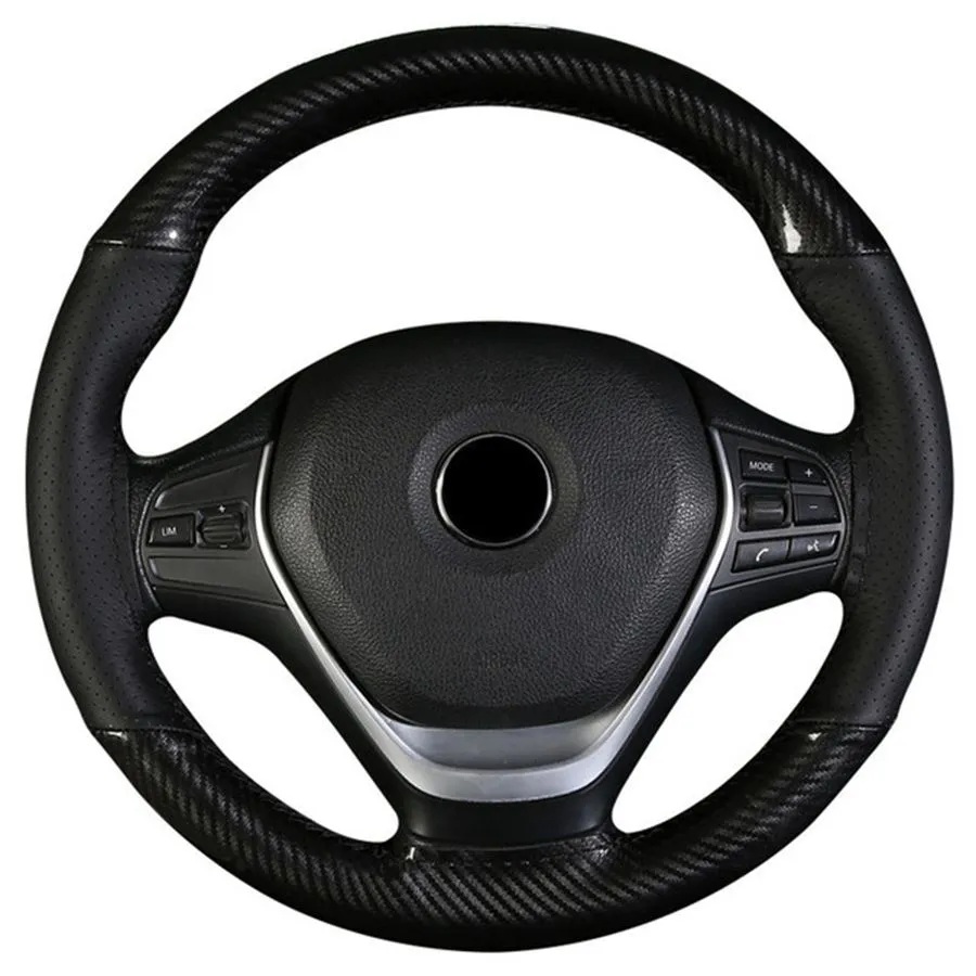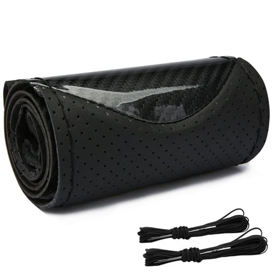 Husa volan din Piele Neagra Perforata + Carbon Black si ata neagra pentru cusut, marime M, diametru 37 - 39 cm, calitate Premium