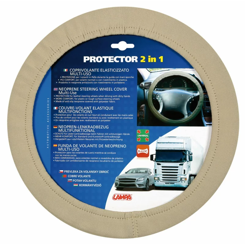 Alege aceasta husa volan elastica 2 in 1 pentru a proteja eficient volanul si pentru a obtine un plus de confort la fiecare drum. Realizata din neopren acoperit cu tesatura din poliester anti-alunecare, husa este potrivita pentru utilizare zilnica, mai ales atunci cand vrei sa protejezi volanele din piele sau sa imbunatatesti prinderea pe suprafete din plastic ori mai aspre. Culoarea bej ofera un aspect discret si placut in interiorul masinii.