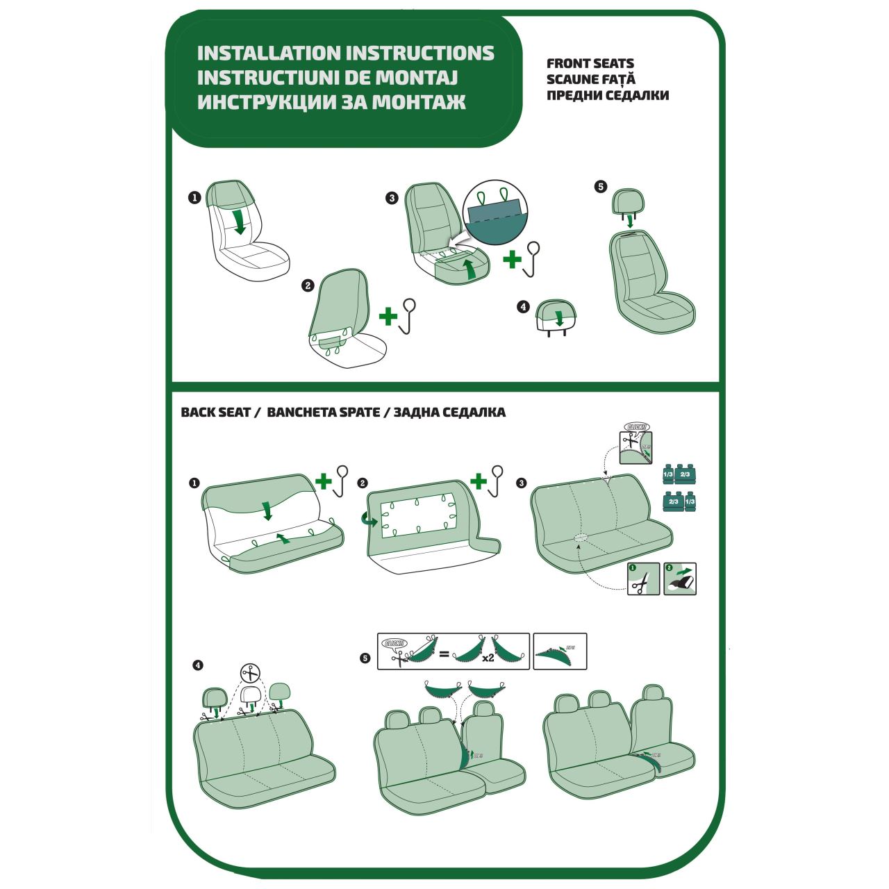 Utilizare: Husele se monteaza pe scaunele din fata si pe bancheta spate, apoi se fixeaza cu ajutorul chingilor elastice si al carligelor metalice, urmand pictogramele de montaj. Sunt potrivite pentru utilizare zilnica si pentru protejarea tapiteriei originale a masinii.