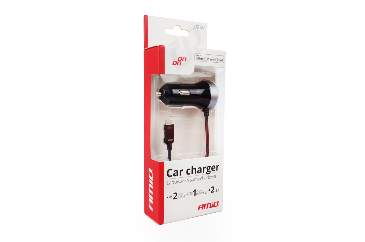 Incarcator auto AMIO 12/24V, cu cablu incarcare conector IOS Lightning + 2x iesiri USB 2.4A
