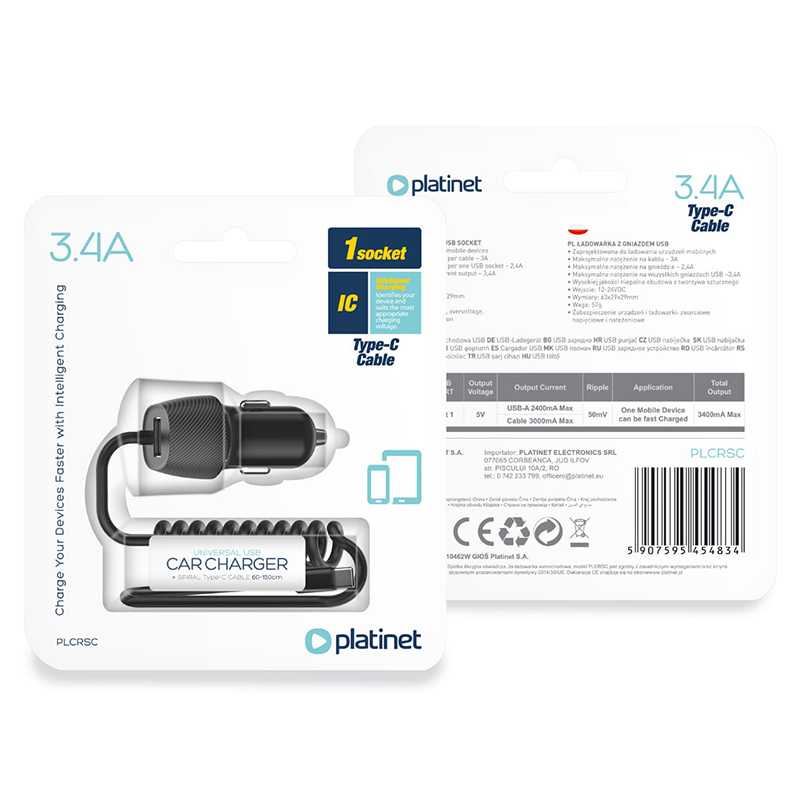 Specificatii INCARCATOR AUTO CABLU SPIRALAT 3.4A TYPE