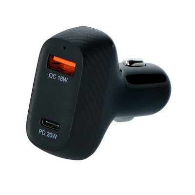 Incarcatatorul dublu de masina este de 12V si 24V cu tehnologie de livrare a energiei si incarcare rapida. Incarcati doua dispozitive diferite simultan. Incarcatorul auto are un conector USB 3.0 pentru incarcare cu pana la 18W si un conector USB Type-C cu capacitate de incarcare de pana la 20W. Incarcatorul auto cu aspect carbon este echipat cu un indicator de incarcare.