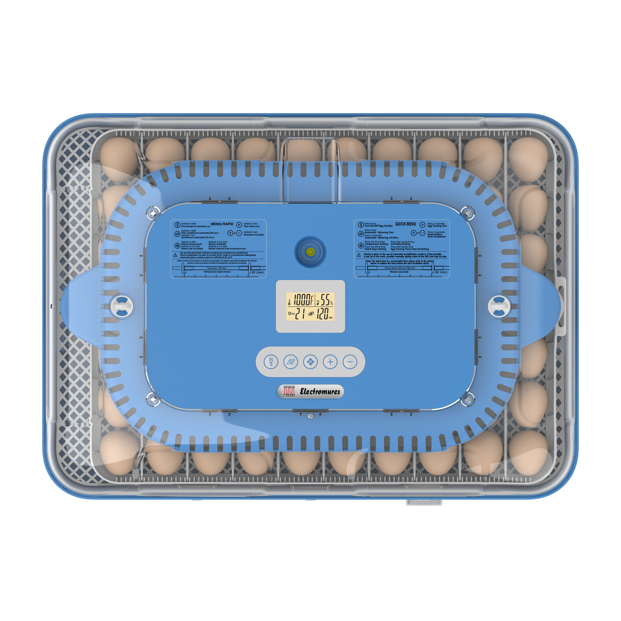 - Afișaj digital pentru temperatură, umiditate și zile de incubație